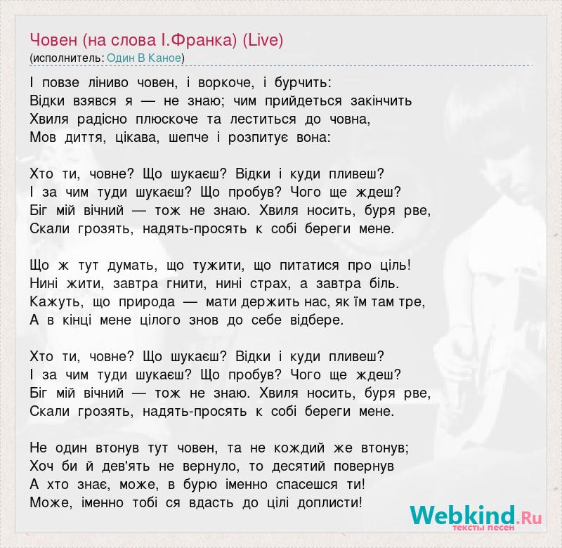 І повзе ліниво човен, і воркоче, і бурчить: Відки взявся я — не знаю; чим прийдеться закінчить Хвиля радісно плюскоче та леститься до човна, Мов диття, цікава, шепче і розпитує вона: Хто ти, човне? Що шукаєш? Відки і куди пливеш? І за чим туди шукаєш? Що пробув? Чого ще ждеш? Біг мій вічний — тож не знаю. Хвиля носить, буря рве, Скали грозять, надять-просять к собі береги мене. Що ж тут думать, що тужити, що питатися про ціль! Нині жити, завтра гнити, нині страх, а завтра біль. Кажуть, що природа — мати держить нас, як їм там тре, А в кінці мене цілого знов до себе відбере. Хто ти, човне? Що шукаєш? Відки і куди пливеш? І за чим туди шукаєш? Що пробув? Чого ще ждеш? Біг мій вічний — тож не знаю. Хвиля носить, буря рве, Скали грозять, надять-просять к собі береги мене. Не один втонув тут човен, та не кождий же втонув; Хоч би й дев'ять не вернуло, то десятий повернув А хто знає, може, в бурю іменно спасешся ти! Може, іменно тобі ся вдасть до цілі доплисти!