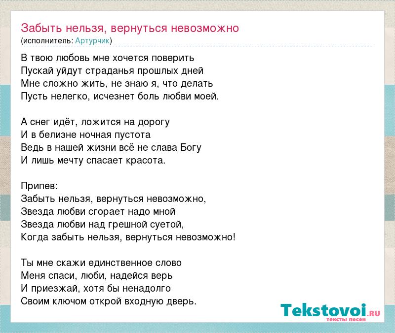 В твою любовь мне хочется поверить Пускай уйдут страданья прошлых дней Мне сложно жить, не знаю я, что делать Пусть нелегко, исчезнет боль любви моей. А снег идёт, ложится на дорогу И в белизне ночная пустота Ведь в нашей жизни всё не слава Богу И лишь мечту спасает красота. Припев: Забыть нельзя, вернуться невозможно, Звезда любви сгорает надо мной Звезда любви над грешной суетой, Когда забыть нельзя, вернуться невозможно! Ты мне скажи единственное слово Меня спаси, люби, надейся верь И приезжай, хотя бы ненадолго Своим ключом открой входную дверь.