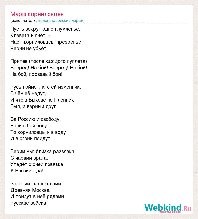 Пусть вокруг одно глумленье, Клевета и гнёт, - Нас - корниловцев, презренье Черни не убьёт. Припев (после каждого куплета): Вперед! На бой! Вперёд! На бой! На бой, кровавый бой! Русь поймёт, кто ей изменник, В чём её недуг, И что в Быкове не Пленник Был, а верный друг. За Россию и свободу, Если в бой зовут, То корниловцы и в воду И в огонь пойдут. Верим мы: близка развязка С чарами врага. Упадёт с очей повязка У России - да! Загремит колоколами Древняя Москва, И пойдут в неё рядами Русские войска!