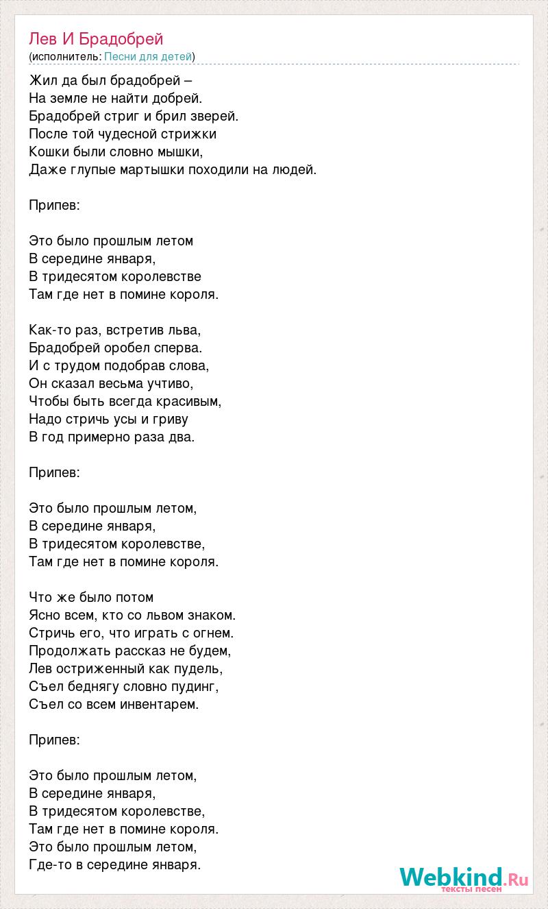 Жил да был брадобрей – На земле не найти добрей. Брадобрей стриг и брил зверей. После той чудесной стрижки Кошки были словно мышки, Даже глупые мартышки походили на людей. Припев: Это было прошлым летом В середине января, В тридесятом королевстве Там где нет в помине короля. Как-то раз, встретив льва, Брадобрей оробел сперва. И с трудом подобрав слова, Он сказал весьма учтиво, Чтобы быть всегда красивым, Надо стричь усы и гриву В год примерно раза два. Припев: Это было прошлым летом, В середине января, В тридесятом королевстве, Там где нет в помине короля. Что же было потом Ясно всем, кто со львом знаком. Стричь его, что играть с огнем. Продолжать рассказ не будем, Лев остриженный как пудель, Съел беднягу словно пудинг, Съел со всем инвентарем. Припев: Это было прошлым летом, В середине января, В тридесятом королевстве, Там где нет в помине короля. Это было прошлым летом, Где-то в середине января.