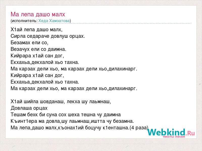 Х1ай лепа дашо малх, Сирла седараче довлуш орцах. Безамах ели со, Везачух ели со даимна. Кийрара х1ай сан дог, Екхахьа,декхалой хьо тахна. Ма карзах дели хьо, ма карзах дели хьо,дилахинарг. Кийрара х1ай сан дог, Екхахьа,декхалой хьо тахна. Ма карзах дели хьо, ма карзах дели хьо,дилахинарг. Х1ай шийла шовданаш, лекха шу лаьмнаш, Довлаша орцах Тешам бехк би суна сох шеха тешна чу даимна Къинт1ера ма довла,шу лаьмнаш,иштта чу безамна. Ма лепа,дашо малх,къонах1ий боцучу к1енташна.(4 раза)