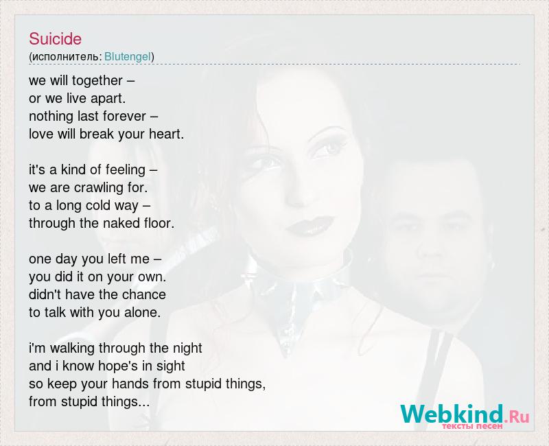 we will together – or we live apart. nothing last forever – love will break your heart. it's a kind of feeling – we are crawling for. to a long cold way – through the naked floor. one day you left me – you did it on your own. didn't have the chance to talk with you alone. i'm walking through the night and i know hope's in sight so keep your hands from stupid things, from stupid things...