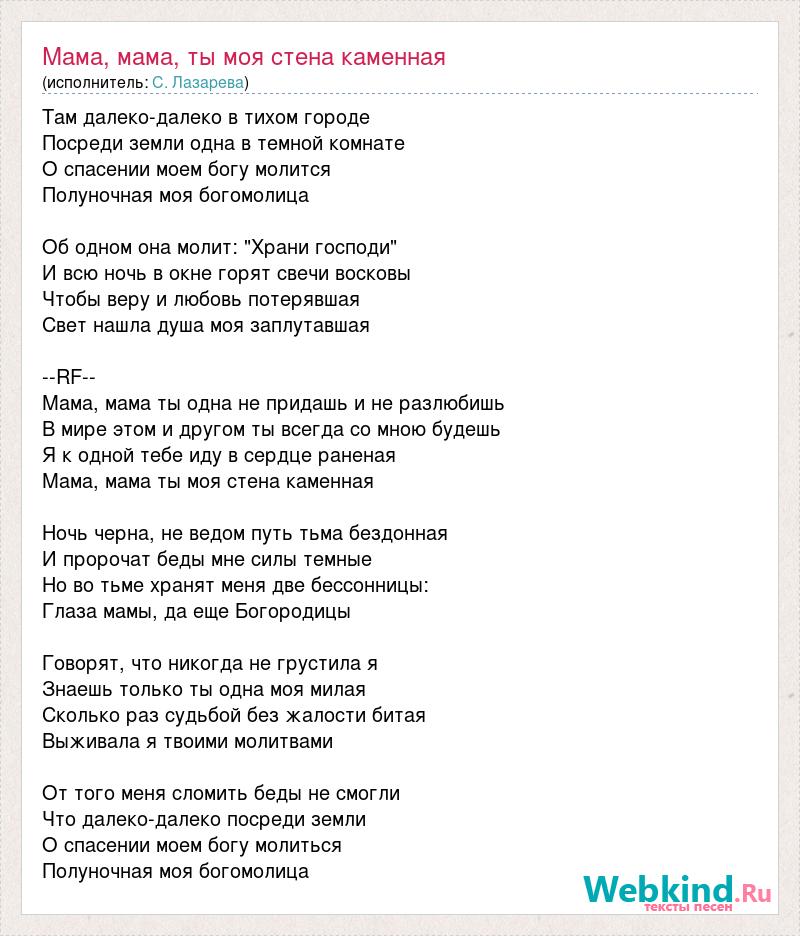 Там далеко-далеко в тихом городе Посреди земли одна в темной комнате О спасении моем богу молится Полуночная моя богомолица Об одном она молит: "Храни господи" И всю ночь в окне горят свечи восковы Чтобы веру и любовь потерявшая Свет нашла душа моя заплутавшая --RF-- Мама, мама ты одна не придашь и не разлюбишь В мире этом и другом ты всегда со мною будешь Я к одной тебе иду в сердце раненая Мама, мама ты моя стена каменная Ночь черна, не ведом путь тьма бездонная И пророчат беды мне силы темные Но во тьме хранят меня две бессонницы: Глаза мамы, да еще Богородицы Говорят, что никогда не грустила я Знаешь только ты одна моя милая Сколько раз судьбой без жалости битая Выживала я твоими молитвами От того меня сломить беды не смогли Что далеко-далеко посреди земли О спасении моем богу молиться Полуночная моя богомолица