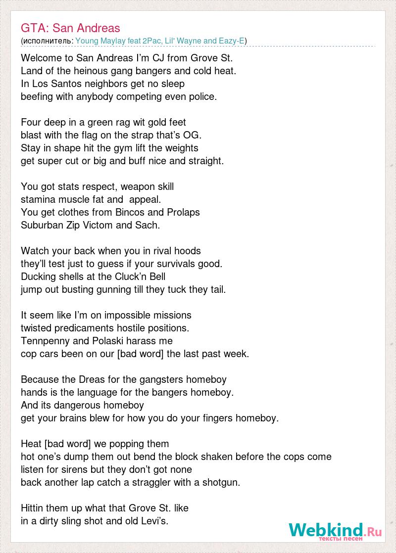 Welcome to San Andreas I’m CJ from Grove St. Land of the heinous gang bangers and cold heat. In Los Santos neighbors get no sleep beefing with anybody competing even police. Four deep in a green rag wit gold feet blast with the flag on the strap that’s OG. Stay in shape hit the gym lift the weights get super cut or big and buff nice and straight. You got stats respect, weapon skill stamina muscle fat and appeal. You get clothes from Bincos and Prolaps Suburban Zip Victom and Sach. Watch your back when you in rival hoods they’ll test just to guess if your survivals good. Ducking shells at the Cluck’n Bell jump out busting gunning till they tuck they tail. It seem like I’m on impossible missions twisted predicaments hostile positions. Tennpenny and Polaski harass me cop cars been on our [bad word] the last past week. Because the Dreas for the gangsters homeboy hands is the language for the bangers homeboy. And its dangerous homeboy get your brains blew for how you do your fingers homeboy. Heat [bad word] we popping them hot one’s dump them out bend the block shaken before the cops come listen for sirens but they don’t got none back another lap catch a straggler with a shotgun. Hittin them up what that Grove St. like in a dirty sling shot and old Levi’s.
