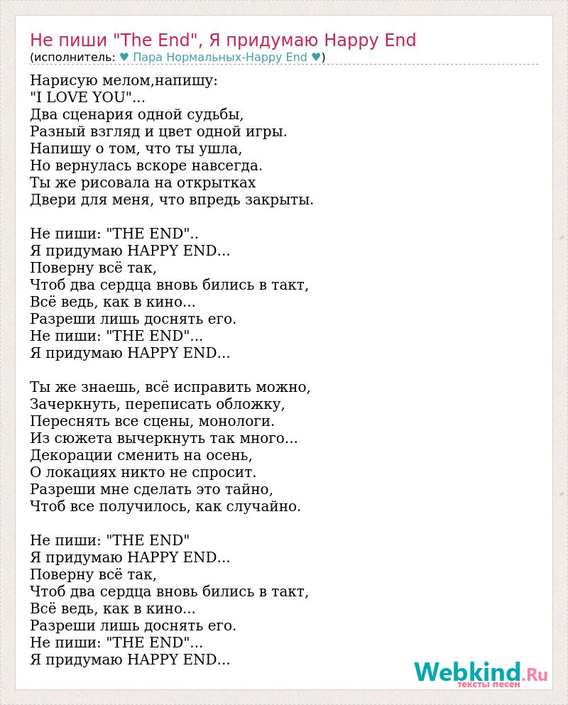 Нарисую мелом,напишу: "I LOVE YOU"... Два сценария одной судьбы, Разный взгляд и цвет одной игры. Напишу о том, что ты ушла, Но вернулась вскоре навсегда. Ты же рисовала на открытках Двери для меня, что впредь закрыты. Не пиши: "THE END".. Я придумаю HAPPY END... Поверну всё так, Чтоб два сердца вновь бились в такт, Всё ведь, как в кино... Разреши лишь доснять его. Не пиши: "THE END"... Я придумаю HAPPY END... Ты же знаешь, всё исправить можно, Зачеркнуть, переписать обложку, Переснять все сцены, монологи. Из сюжета вычеркнуть так много... Декорации сменить на осень, О локациях никто не спросит. Разреши мне сделать это тайно, Чтоб все получилось, как случайно. Не пиши: "THE END" Я придумаю HAPPY END... Поверну всё так, Чтоб два сердца вновь бились в такт, Всё ведь, как в кино... Разреши лишь доснять его. Не пиши: "THE END"... Я придумаю HAPPY END...
