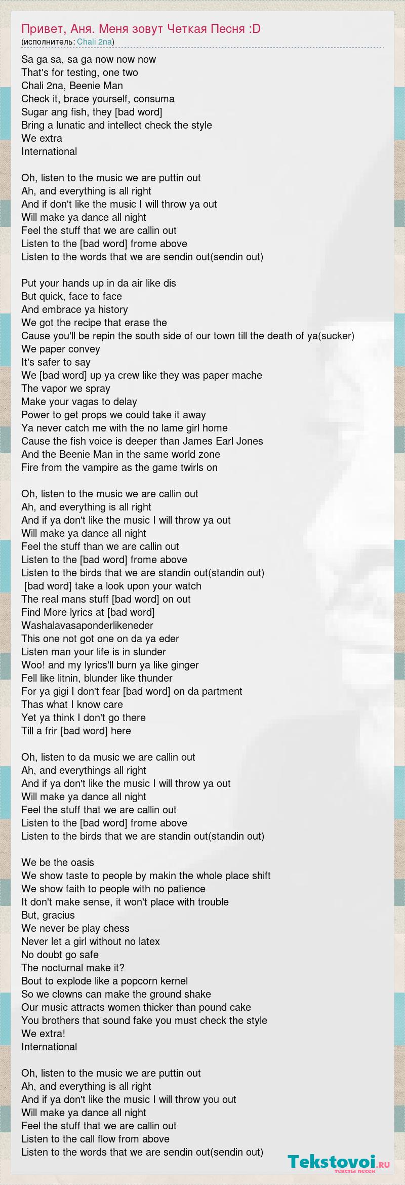 Sa ga sa, sa ga now now now That's for testing, one two Chali 2na, Beenie Man Check it, brace yourself, consuma Sugar ang fish, they [bad word] Bring a lunatic and intellect check the style We extra International Oh, listen to the music we are puttin out Ah, and everything is all right And if don't like the music I will throw ya out Will make ya dance all night Feel the stuff that we are callin out Listen to the [bad word] frome above Listen to the words that we are sendin out(sendin out) Put your hands up in da air like dis But quick, face to face And embrace ya history We got the recipe that erase the Cause you'll be repin the south side of our town till the death of ya(sucker) We paper convey It's safer to say We [bad word] up ya crew like they was paper mache The vapor we spray Make your vagas to delay Power to get props we could take it away Ya never catch me with the no lame girl home Cause the fish voice is deeper than James Earl Jones And the Beenie Man in the same world zone Fire from the vampire as the game twirls on Oh, listen to the music we are callin out Ah, and everything is all right And if ya don't like the music I will throw ya out Will make ya dance all night Feel the stuff than we are callin out Listen to the [bad word] frome above Listen to the birds that we are standin out(standin out) [bad word] take a look upon your watch The real mans stuff [bad word] on out Find More lyrics at [bad word] Washalavasaponderlikeneder This one not got one on da ya eder Listen man your life is in slunder Woo! and my lyrics'll burn ya like ginger Fell like litnin, blunder like thunder For ya gigi I don't fear [bad word] on da partment Thas what I know care Yet ya think I don't go there Till a frir [bad word] here Oh, listen to da music we are callin out Ah, and everythings all right And if ya don't like the music I will throw ya out Will make ya dance all night Feel the stuff that we are callin out Listen to the [bad word] frome above Listen to the birds that we are standin out(standin out) We be the oasis We show taste to people by makin the whole place shift We show faith to people with no patience It don't make sense, it won't place with trouble But, gracius We never be play chess Never let a girl without no latex No doubt go safe The nocturnal make it? Bout to explode like a popcorn kernel So we clowns can make the ground shake Our music attracts women thicker than pound cake You brothers that sound fake you must check the style We extra! International Oh, listen to the music we are puttin out Ah, and everything is all right And if ya don't like the music I will throw you out Will make ya dance all night Feel the stuff that we are callin out Listen to the call flow from above Listen to the words that we are sendin out(sendin out)