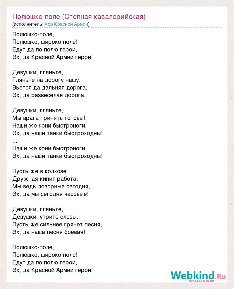 Полюшко-поле, Полюшко, широко поле! Едут да по полю герои, Эх, да Красной Армии герои! Девушки, гляньте, Гляньте на дорогу нашу. Вьется да дальняя дорога, Эх, да развеселая дорога. Девушки, гляньте, Мы врага принять готовы! Наши же кони быстроноги, Эх, да наши танки быстроходны! ... Наши же кони быстроноги, Эх, да наши танки быстроходны! Пусть же в колхозе Дружная кипит работа. Мы ведь дозорные сегодня, Эх, да мы сегодня часовые! Девушки, гляньте, Девушки, утрите слезы. Пусть же сильнее грянет песня, Эх, да наша песня боевая! Полюшко-поле, Полюшко, широко поле! Едут да по полю герои, Эх, да Красной Армии герои!