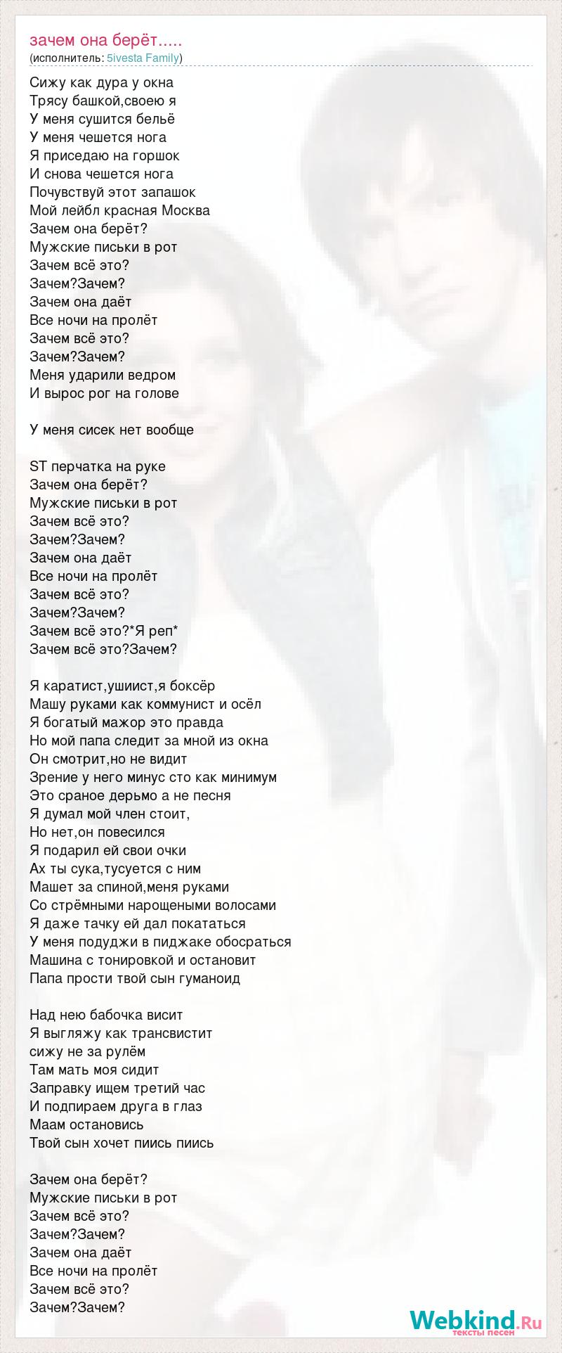 Сижу как дура у окна Трясу башкой,своею я У меня сушится бельё У меня чешется нога Я приседаю на горшок И снова чешется нога Почувствуй этот запашок Мой лейбл красная Москва Зачем она берёт? Мужские письки в рот Зачем всё это? Зачем?Зачем? Зачем она даёт Все ночи на пролёт Зачем всё это? Зачем?Зачем? Меня ударили ведром И вырос рог на голове У меня сисек нет вообще ST перчатка на руке Зачем она берёт? Мужские письки в рот Зачем всё это? Зачем?Зачем? Зачем она даёт Все ночи на пролёт Зачем всё это? Зачем?Зачем? Зачем всё это?*Я реп* Зачем всё это?Зачем? Я каратист,ушиист,я боксёр Машу руками как коммунист и осёл Я богатый мажор это правда Но мой папа следит за мной из окна Он смотрит,но не видит Зрение у него минус сто как минимум Это сраное дерьмо а не песня Я думал мой член стоит, Но нет,он повесился Я подарил ей свои очки Ах ты сука,тусуется с ним Машет за спиной,меня руками Со стрёмными нарощеными волосами Я даже тачку ей дал покататься У меня подуджи в пиджаке обосраться Машина с тонировкой и остановит Папа прости твой сын гуманоид Над нею бабочка висит Я выгляжу как трансвистит сижу не за рулём Там мать моя сидит Заправку ищем третий час И подпираем друга в глаз Маам остановись Твой сын хочет пиись пиись Зачем она берёт? Мужские письки в рот Зачем всё это? Зачем?Зачем? Зачем она даёт Все ночи на пролёт Зачем всё это? Зачем?Зачем?