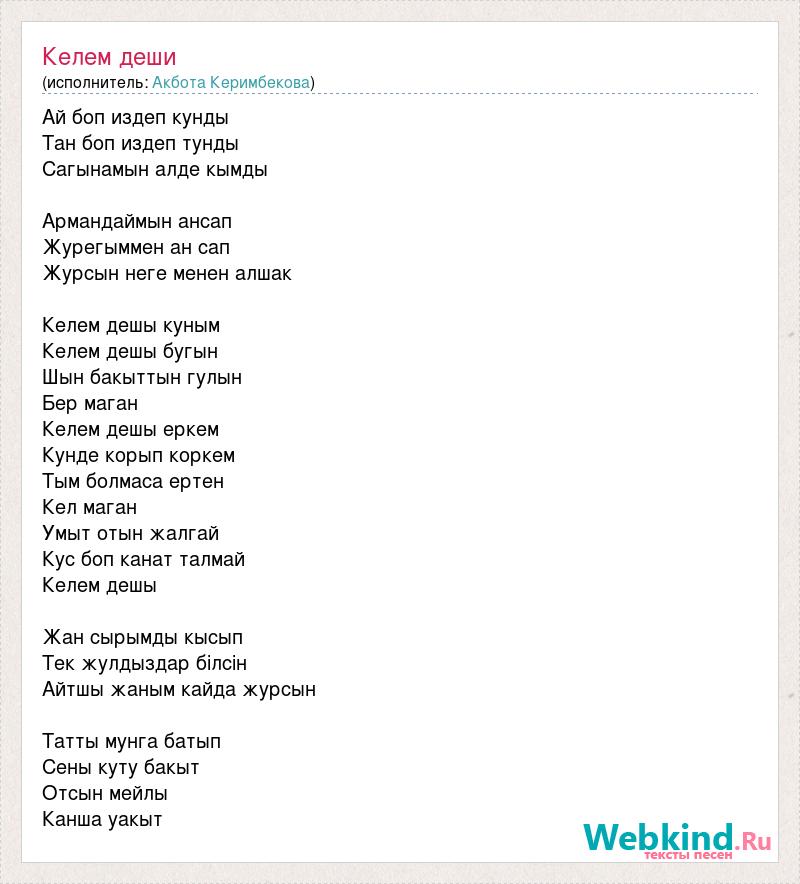 Ай боп издеп кунды Тан боп издеп тунды Сагынамын алде кымды Армандаймын ансап Журегыммен ан сап Журсын неге менен алшак Келем дешы куным Келем дешы бугын Шын бакыттын гулын Бер маган Келем дешы еркем Кунде корып коркем Тым болмаса ертен Кел маган Умыт отын жалгай Кус боп канат талмай Келем дешы Жан сырымды кысып Тек жулдыздар білсін Айтшы жаным кайда журсын Татты мунга батып Сены куту бакыт Отсын мейлы Канша уакыт