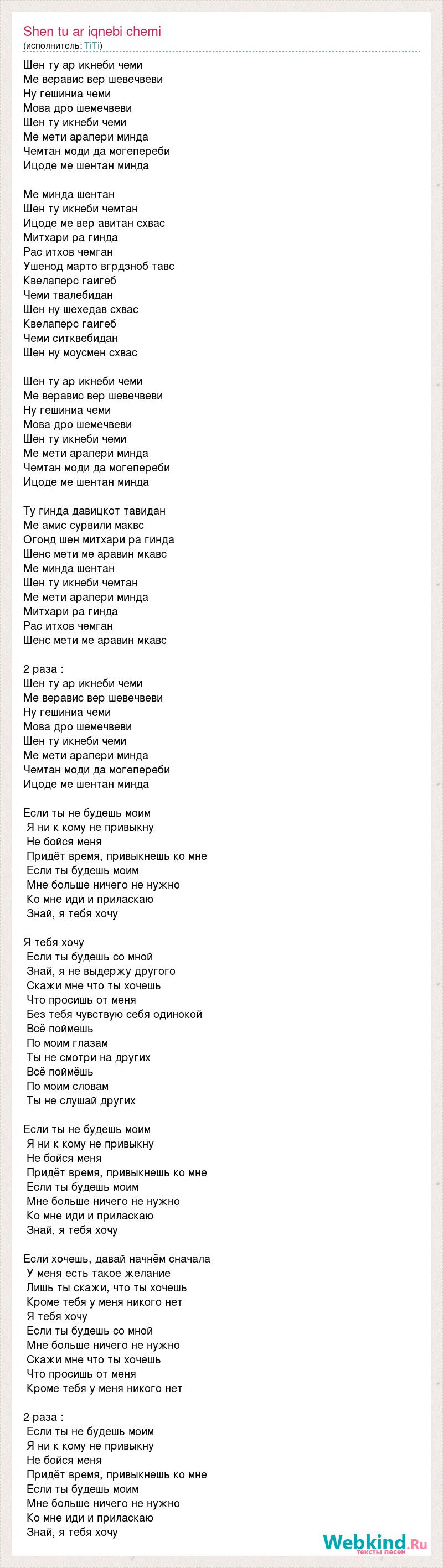 Шен ту ар икнеби чеми Ме веравис вер шевечвеви Ну гешиниа чеми Мова дро шемечвеви Шен ту икнеби чеми Ме мети арапери минда Чемтан моди да могепереби Ицоде ме шентан минда Ме минда шентан Шен ту икнеби чемтан Ицоде ме вер авитан схвас Митхари ра гинда Рас итхов чемган Ушенод марто вгрдзноб тавс Квелаперс гаигеб Чеми твалебидан Шен ну шехедав схвас Квелаперс гаигеб Чеми ситквебидан Шен ну моусмен схвас Шен ту ар икнеби чеми Ме веравис вер шевечвеви Ну гешиниа чеми Мова дро шемечвеви Шен ту икнеби чеми Ме мети арапери минда Чемтан моди да могепереби Ицоде ме шентан минда Ту гинда давицкот тавидан Ме амис сурвили маквс Огонд шен митхари ра гинда Шенс мети ме аравин мкавс Ме минда шентан Шен ту икнеби чемтан Ме мети арапери минда Митхари ра гинда Рас итхов чемган Шенс мети ме аравин мкавс 2 раза : Шен ту ар икнеби чеми Ме веравис вер шевечвеви Ну гешиниа чеми Мова дро шемечвеви Шен ту икнеби чеми Ме мети арапери минда Чемтан моди да могепереби Ицоде ме шентан минда Если ты не будешь моим Я ни к кому не привыкну Не бойся меня Придёт время, привыкнешь ко мне Если ты будешь моим Мне больше ничего не нужно Ко мне иди и приласкаю Знай, я тебя хочу Я тебя хочу Если ты будешь со мной Знай, я не выдержу другого Скажи мне что ты хочешь Что просишь от меня Без тебя чувствую себя одинокой Всё поймешь По моим глазам Ты не смотри на других Всё поймёшь По моим словам Ты не слушай других Если ты не будешь моим Я ни к кому не привыкну Не бойся меня Придёт время, привыкнешь ко мне Если ты будешь моим Мне больше ничего не нужно Ко мне иди и приласкаю Знай, я тебя хочу Если хочешь, давай начнём сначала У меня есть такое желание Лишь ты скажи, что ты хочешь Кроме тебя у меня никого нет Я тебя хочу Если ты будешь со мной Мне больше ничего не нужно Скажи мне что ты хочешь Что просишь от меня Кроме тебя у меня никого нет 2 раза : Если ты не будешь моим Я ни к кому не привыкну Не бойся меня Придёт время, привыкнешь ко мне Если ты будешь моим Мне больше ничего не нужно Ко мне иди и приласкаю Знай, я тебя хочу