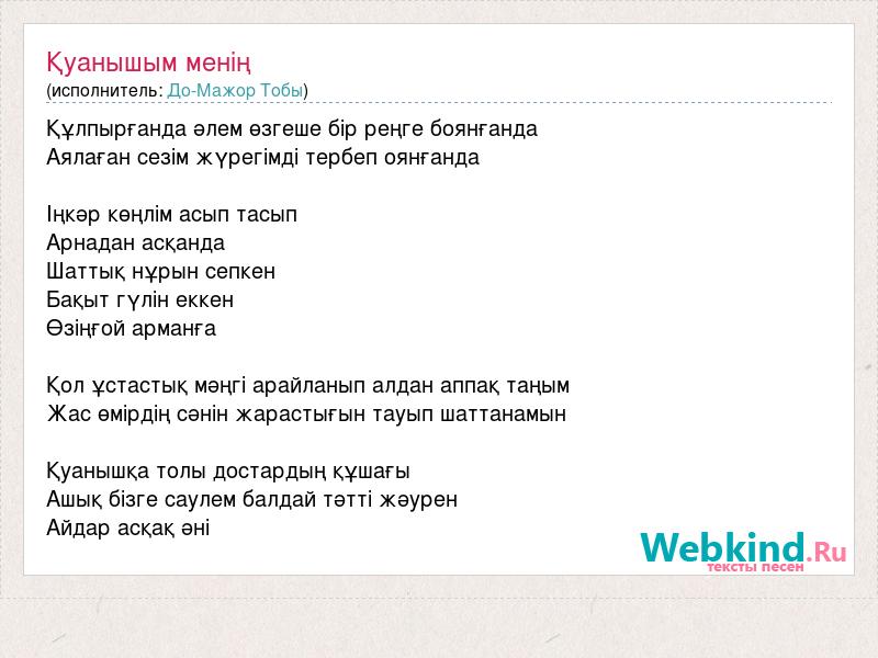 Құлпырғанда әлем өзгеше бір реңге боянғанда Аялаған сезім жүрегімді тербеп оянғанда Іңкәр көңлім асып тасып Арнадан асқанда Шаттық нұрын сепкен Бақыт гүлін еккен Өзіңғой арманға Қол ұстастық мәңгі арайланып алдан аппақ таңым Жас өмірдің сәнін жарастығын тауып шаттанамын Қуанышқа толы достардың құшағы Ашық бізге саулем балдай тәтті жәурен Айдар асқақ әні