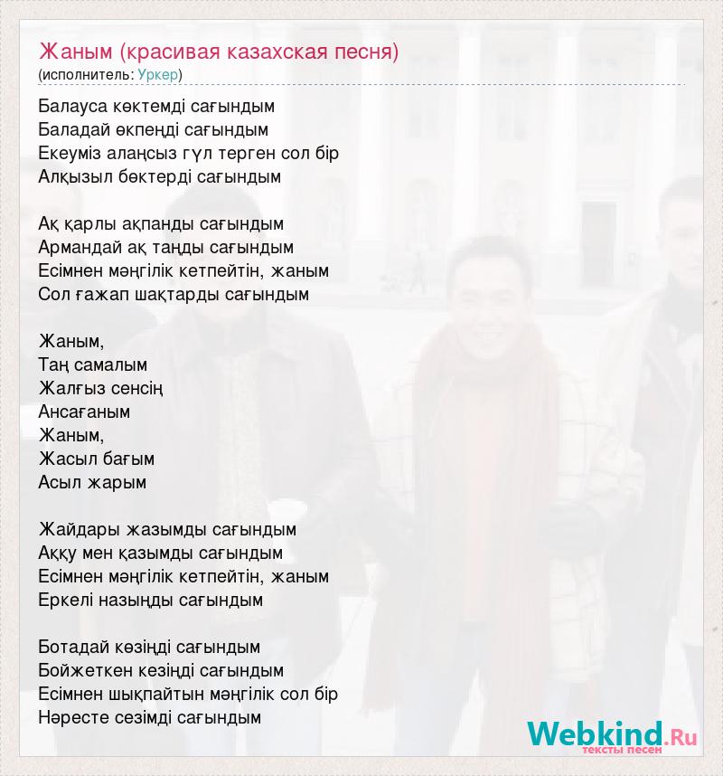 Балауса көктемді сағындым Баладай өкпеңді сағындым Екеуміз алаңсыз гүл терген сол бір Алқызыл бөктерді сағындым Ақ қарлы ақпанды сағындым Армандай ақ таңды сағындым Есімнен мәңгілік кетпейтін, жаным Сол ғажап шақтарды сағындым Жаным, Таң самалым Жалғыз сенсің Ансағаным Жаным, Жасыл бағым Асыл жарым Жайдары жазымды сағындым Аққу мен қазымды сағындым Есімнен мәңгілік кетпейтін, жаным Еркелі назыңды сағындым Ботадай көзіңді сағындым Бойжеткен кезіңді сағындым Есімнен шықпайтын мәңгілік сол бір Нәресте сезімді сағындым