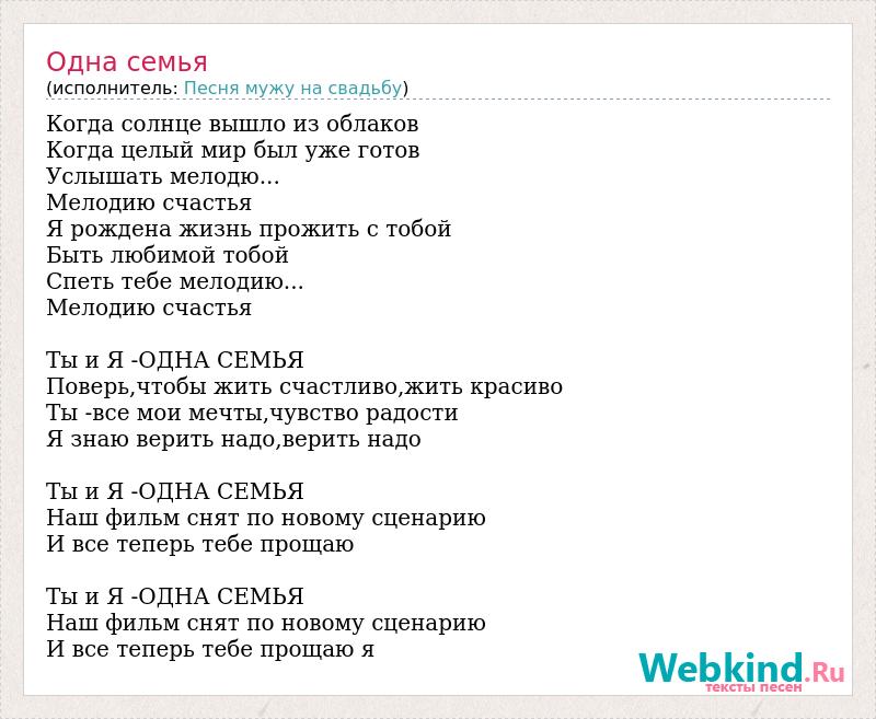 Когда солнце вышло из облаков Когда целый мир был уже готов Услышать мелодю... Мелодию счастья Я рождена жизнь прожить с тобой Быть любимой тобой Спеть тебе мелодию... Мелодию счастья Ты и Я -ОДНА СЕМЬЯ Поверь,чтобы жить счастливо,жить красиво Ты -все мои мечты,чувство радости Я знаю верить надо,верить надо Ты и Я -ОДНА СЕМЬЯ Наш фильм снят по новому сценарию И все теперь тебе прощаю Ты и Я -ОДНА СЕМЬЯ Наш фильм снят по новому сценарию И все теперь тебе прощаю я