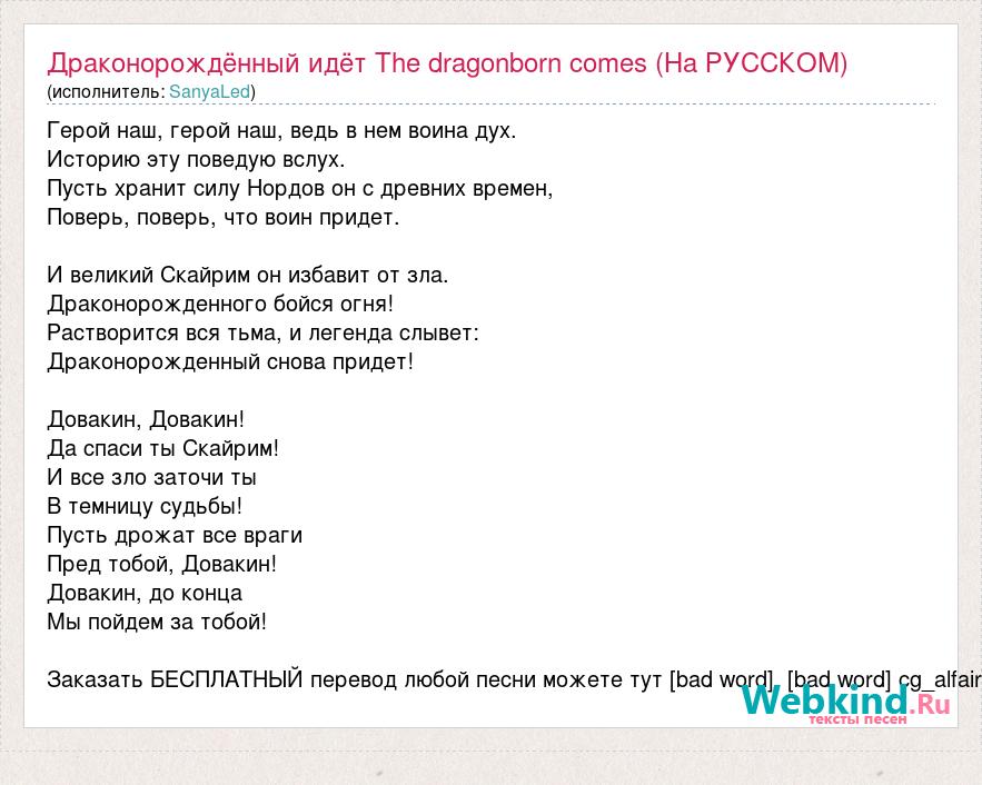 Герой наш, герой наш, ведь в нем воина дух. Историю эту поведую вслух. Пусть хранит силу Нордов он с древних времен, Поверь, поверь, что воин придет. И великий Скайрим он избавит от зла. Драконорожденного бойся огня! Растворится вся тьма, и легенда слывет: Драконорожденный снова придет! Довакин, Довакин! Да спаси ты Скайрим! И все зло заточи ты В темницу судьбы! Пусть дрожат все враги Пред тобой, Довакин! Довакин, до конца Мы пойдем за тобой! Заказать БЕСПЛАТНЫЙ перевод любой песни можете тут [bad word] [bad word] cg_alfair