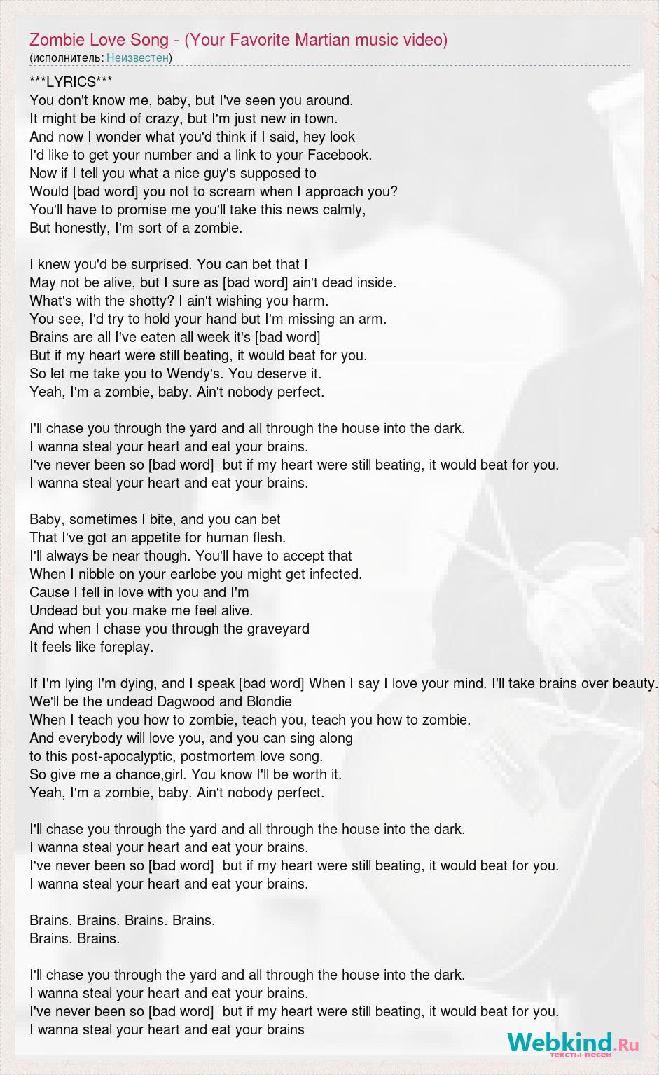 ***LYRICS*** You don't know me, baby, but I've seen you around. It might be kind of crazy, but I'm just new in town. And now I wonder what you'd think if I said, hey look I'd like to get your number and a link to your Facebook. Now if I tell you what a nice guy's supposed to Would [bad word] you not to scream when I approach you? You'll have to promise me you'll take this news calmly, But honestly, I'm sort of a zombie. I knew you'd be surprised. You can bet that I May not be alive, but I sure as [bad word] ain't dead inside. What's with the shotty? I ain't wishing you harm. You see, I'd try to hold your hand but I'm missing an arm. Brains are all I've eaten all week it's [bad word] But if my heart were still beating, it would beat for you. So let me take you to Wendy's. You deserve it. Yeah, I'm a zombie, baby. Ain't nobody perfect. I'll chase you through the yard and all through the house into the dark. I wanna steal your heart and eat your brains. I've never been so [bad word] but if my heart were still beating, it would beat for you. I wanna steal your heart and eat your brains. Baby, sometimes I bite, and you can bet That I've got an appetite for human flesh. I'll always be near though. You'll have to accept that When I nibble on your earlobe you might get infected. Cause I fell in love with you and I'm Undead but you make me feel alive. And when I chase you through the graveyard It feels like foreplay. If I'm lying I'm dying, and I speak [bad word] When I say I love your mind. I'll take brains over beauty. We'll be the undead Dagwood and Blondie When I teach you how to zombie, teach you, teach you how to zombie. And everybody will love you, and you can sing along to this post-apocalyptic, postmortem love song. So give me a chance,girl. You know I'll be worth it. Yeah, I'm a zombie, baby. Ain't nobody perfect. I'll chase you through the yard and all through the house into the dark. I wanna steal your heart and eat your brains. I've never been so [bad word] but if my heart were still beating, it would beat for you. I wanna steal your heart and eat your brains. Brains. Brains. Brains. Brains. Brains. Brains. I'll chase you through the yard and all through the house into the dark. I wanna steal your heart and eat your brains. I've never been so [bad word] but if my heart were still beating, it would beat for you. I wanna steal your heart and eat your brains