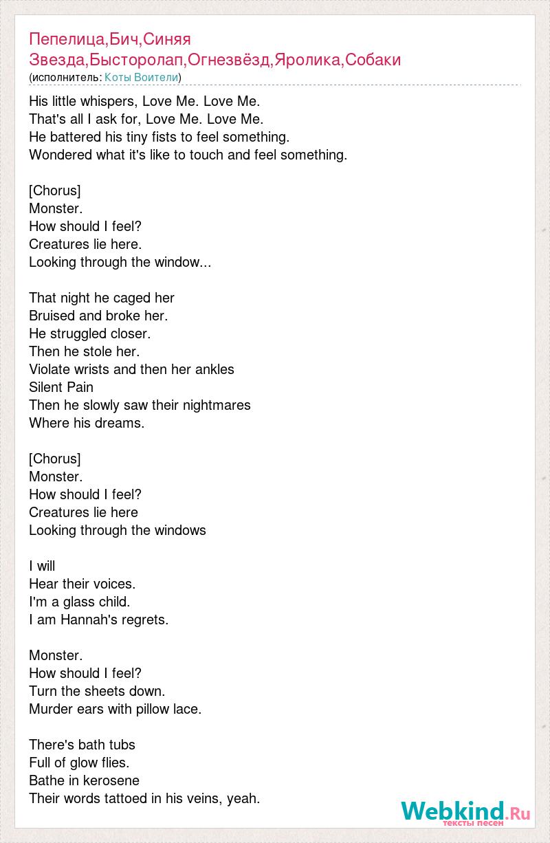 His little whispers, Love Me. Love Me. That's all I ask for, Love Me. Love Me. He battered his tiny fists to feel something. Wondered what it's like to touch and feel something. [Chorus] Monster. How should I feel? Creatures lie here. Looking through the window... That night he caged her Bruised and broke her. He struggled closer. Then he stole her. Violate wrists and then her ankles Silent Pain Then he slowly saw their nightmares Where his dreams. [Chorus] Monster. How should I feel? Creatures lie here Looking through the windows I will Hear their voices. I'm a glass child. I am Hannah's regrets. Monster. How should I feel? Turn the sheets down. Murder ears with pillow lace. There's bath tubs Full of glow flies. Bathe in kerosene Their words tattoed in his veins, yeah.