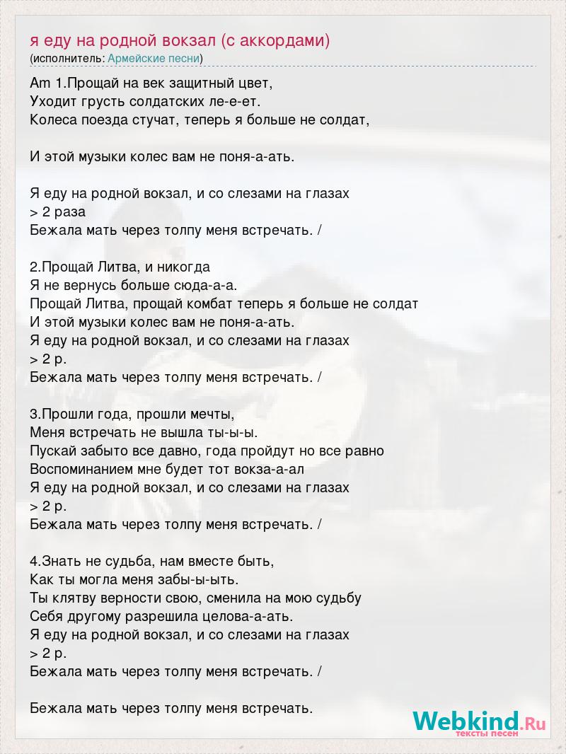 Аm 1.Прощай на век защитный цвет, Уходит грусть солдатских ле-е-ет. Колеса поезда стучат, теперь я больше не солдат, И этой музыки колес вам не поня-а-ать. Я еду на родной вокзал, и со слезами на глазах > 2 раза Бежала мать через толпу меня встречать. / 2.Прощай Литва, и никогда Я не вернусь больше сюда-а-а. Прощай Литва, прощай комбат теперь я больше не солдат И этой музыки колес вам не поня-а-ать. Я еду на родной вокзал, и со слезами на глазах > 2 р. Бежала мать через толпу меня встречать. / 3.Прошли года, прошли мечты, Меня встречать не вышла ты-ы-ы. Пускай забыто все давно, года пройдут но все равно Воспоминанием мне будет тот вокза-а-ал Я еду на родной вокзал, и со слезами на глазах > 2 р. Бежала мать через толпу меня встречать. / 4.Знать не судьба, нам вместе быть, Как ты могла меня забы-ы-ыть. Ты клятву верности свою, сменила на мою судьбу Себя другому разрешила целова-а-ать. Я еду на родной вокзал, и со слезами на глазах > 2 р. Бежала мать через толпу меня встречать. / Бежала мать через толпу меня встречать.