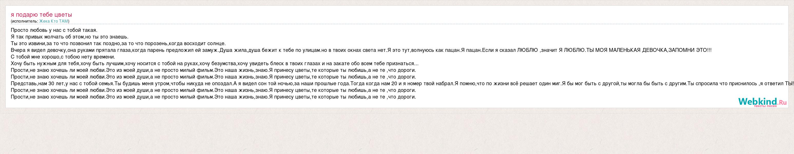 Просто любовь у нас с тобой такая. Я так привык молчать об этом,но ты это знаешь. Ты это извини,за то что позвонил так поздно,за то что порозень,когда восходит солнце. Вчера я видел девочку,она руками прятала глаза,когда парень предложил ей замуж.Душа жила,душа бежит к тебе по улицам.но в твоих окнах света нет.Я это тут,волнуюсь как пацан.Я пацан.Если я сказал ЛЮБЛЮ ,значит Я ЛЮБЛЮ.ТЫ МОЯ МАЛЕНЬКАЯ ДЕВОЧКА,ЗАПОМНИ ЭТО!!! С тобой мне хорошо,с тобою нету времени. Хочу быть нужным для тебя,хочу быть лучшим,хочу носится с тобой на руках,хочу безумства,хочу увидеть блеск в твоих глазах и на закате обо всем тебе признаться... Прости,не знаю хочешь ли моей любви.Это из моей души,а не просто милый фильм.Это наша жизнь,знаю.Я принесу цветы,те которые ты любишь,а не те ,что дороги. Прости,не знаю хочешь ли моей любви.Это из моей души,а не просто милый фильм.Это наша жизнь,знаю.Я принесу цветы,те которые ты любишь,а не те ,что дороги. Представь,нам 30 лет,у нас с тобой семья.Ты будишь меня утром,чтобы никуда не опоздал.А я видел сон той ночью,за наши прошлые года.Тогда когда нам 20 и я номер твой набрал.Я помню,что по жизни всё решает один миг.Я бы мог быть с другой,ты могла бы быть с другим.Ты спросила что приснилось ,я ответил ТЫ! Прости,не знаю хочешь ли моей любви.Это из моей души,а не просто милый фильм.Это наша жизнь,знаю.Я принесу цветы,те которые ты любишь,а не те ,что дороги. Прости,не знаю хочешь ли моей любви.Это из моей души,а не просто милый фильм.Это наша жизнь,знаю.Я принесу цветы,те которые ты любишь,а не те ,что дороги.