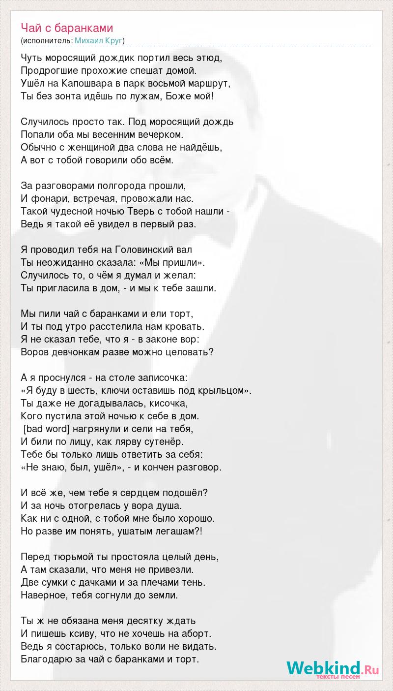 Чуть моросящий дождик портил весь этюд, Продрогшие прохожие спешат домой. Ушёл на Капошвара в парк восьмой маршрут, Ты без зонта идёшь по лужам, Боже мой! Случилось просто так. Под моросящий дождь Попали оба мы весенним вечерком. Обычно с женщиной два слова не найдёшь, А вот с тобой говорили обо всём. За разговорами полгорода прошли, И фонари, встречая, провожали нас. Такой чудесной ночью Тверь с тобой нашли - Ведь я такой её увидел в первый раз. Я проводил тебя на Головинский вал Ты неожиданно сказала: «Мы пришли». Случилось то, о чём я думал и желал: Ты пригласила в дом, - и мы к тебе зашли. Мы пили чай с баранками и ели торт, И ты под утро расстелила нам кровать. Я не сказал тебе, что я - в законе вор: Воров девчонкам разве можно целовать? А я проснулся - на столе записочка: «Я буду в шесть, ключи оставишь под крыльцом». Ты даже не догадывалась, кисочка, Кого пустила этой ночью к себе в дом. [bad word] нагрянули и сели на тебя, И били по лицу, как лярву сутенёр. Тебе бы только лишь ответить за себя: «Не знаю, был, ушёл», - и кончен разговор. И всё же, чем тебе я сердцем подошёл? И за ночь отогрелась у вора душа. Как ни с одной, с тобой мне было хорошо. Но разве им понять, ушатым легашам?! Перед тюрьмой ты простояла целый день, А там сказали, что меня не привезли. Две сумки с дачками и за плечами тень. Наверное, тебя согнули до земли. Ты ж не обязана меня десятку ждать И пишешь ксиву, что не хочешь на аборт. Ведь я состарюсь, только воли не видать. Благодарю за чай с баранками и торт.