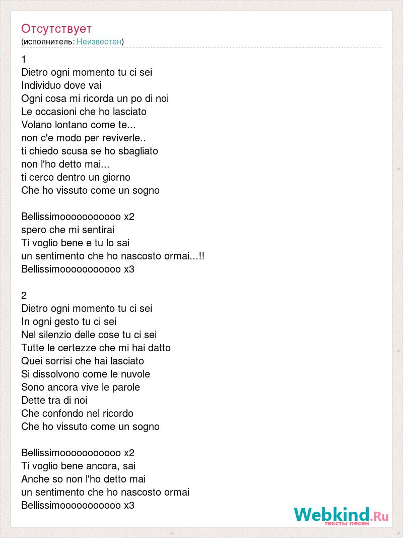 1 Dietro ogni momento tu ci sei Individuo dove vai Ogni cosa mi ricorda un po di noi Le occasioni che ho lasciato Volano lontano come te... non c'e modo per reviverle.. ti chiedo scusa se ho sbagliato non l'ho detto mai... ti cerco dentro un giorno Che ho vissuto come un sogno Bellissimooooooooooo x2 spero che mi sentirai Ti voglio bene e tu lo sai un sentimento che ho nascosto ormai...!! Bellissimooooooooooo x3 2 Dietro ogni momento tu ci sei In ogni gesto tu ci sei Nel silenzio delle cose tu ci sei Tutte le certezze che mi hai datto Quei sorrisi che hai lasciato Si dissolvono come le nuvole Sono ancora vive le parole Dette tra di noi Che confondo nel ricordo Che ho vissuto come un sogno Bellissimooooooooooo x2 Ti voglio bene ancora, sai Anche so non l'ho detto mai un sentimento che ho nascosto ormai Bellissimooooooooooo x3