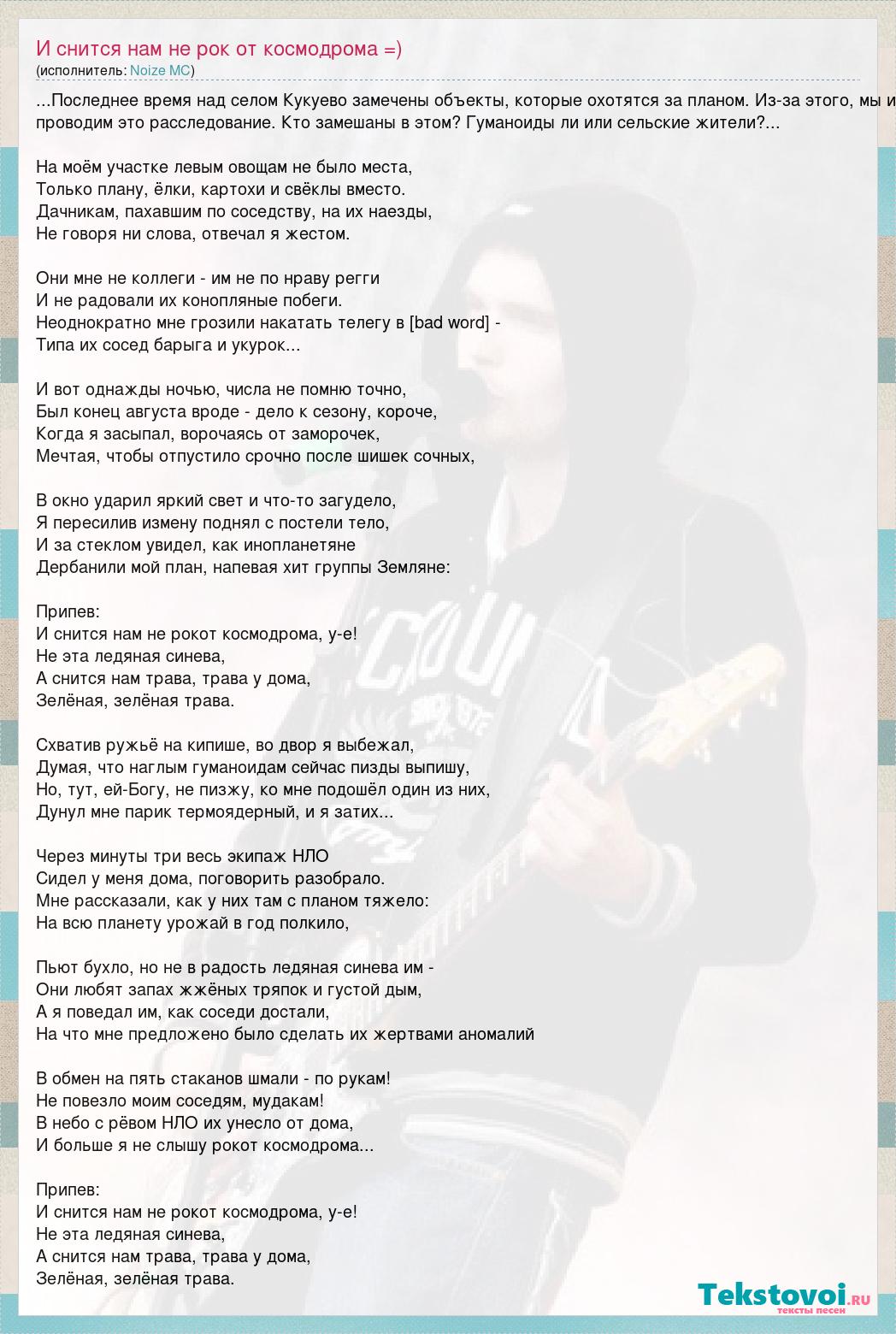 ...Последнее время над селом Кукуево замечены объекты, которые охотятся за планом. Из-за этого, мы и проводим это расследование. Кто замешаны в этом? Гуманоиды ли или сельские жители?... На моём участке левым овощам не было места, Только плану, ёлки, картохи и свёклы вместо. Дачникам, пахавшим по соседству, на их наезды, Не говоря ни слова, отвечал я жестом. Они мне не коллеги - им не по нраву регги И не радовали их конопляные побеги. Неоднократно мне грозили накатать телегу в [bad word] - Типа их сосед барыга и укурок... И вот однажды ночью, числа не помню точно, Был конец августа вроде - дело к сезону, короче, Когда я засыпал, ворочаясь от заморочек, Мечтая, чтобы отпустило срочно после шишек сочных, В окно ударил яркий свет и что-то загудело, Я пересилив измену поднял с постели тело, И за стеклом увидел, как инопланетяне Дербанили мой план, напевая хит группы Земляне: Припев: И снится нам не рокот космодрома, у-е! Не эта ледяная синева, А снится нам трава, трава у дома, Зелёная, зелёная трава. Схватив ружьё на кипише, во двор я выбежал, Думая, что наглым гуманоидам сейчас пизды выпишу, Но, тут, ей-Богу, не пизжу, ко мне подошёл один из них, Дунул мне парик термоядерный, и я затих... Через минуты три весь экипаж НЛО Сидел у меня дома, поговорить разобрало. Мне рассказали, как у них там с планом тяжело: На всю планету урожай в год полкило, Пьют бухло, но не в радость ледяная синева им - Они любят запах жжёных тряпок и густой дым, А я поведал им, как соседи достали, На что мне предложено было сделать их жертвами аномалий В обмен на пять стаканов шмали - по рукам! Не повезло моим соседям, мудакам! В небо с рёвом НЛО их унесло от дома, И больше я не слышу рокот космодрома... Припев: И снится нам не рокот космодрома, у-е! Не эта ледяная синева, А снится нам трава, трава у дома, Зелёная, зелёная трава.