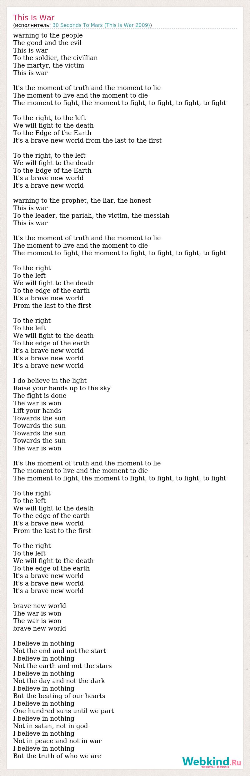 warning to the people The good and the evil This is war To the soldier, the civillian The martyr, the victim This is war It's the moment of truth and the moment to lie The moment to live and the moment to die The moment to fight, the moment to fight, to fight, to fight, to fight To the right, to the left We will fight to the death To the Edge of the Earth It's a brave new world from the last to the first To the right, to the left We will fight to the death To the Edge of the Earth It's a brave new world It's a brave new world warning to the prophet, the liar, the honest This is war To the leader, the pariah, the victim, the messiah This is war It's the moment of truth and the moment to lie The moment to live and the moment to die The moment to fight, the moment to fight, to fight, to fight, to fight To the right To the left We will fight to the death To the edge of the earth It's a brave new world From the last to the first To the right To the left We will fight to the death To the edge of the earth It's a brave new world It's a brave new world It's a brave new world I do believe in the light Raise your hands up to the sky The fight is done The war is won Lift your hands Towards the sun Towards the sun Towards the sun Towards the sun The war is won It's the moment of truth and the moment to lie The moment to live and the moment to die The moment to fight, the moment to fight, to fight, to fight, to fight To the right To the left We will fight to the death To the edge of the earth It's a brave new world From the last to the first To the right To the left We will fight to the death To the edge of the earth It's a brave new world It's a brave new world It's a brave new world brave new world The war is won The war is won brave new world I believe in nothing Not the end and not the start I believe in nothing Not the earth and not the stars I believe in nothing Not the day and not the dark I believe in nothing But the beating of our hearts I believe in nothing One hundred suns until we part I believe in nothing Not in satan, not in god I believe in nothing Not in peace and not in war I believe in nothing But the truth of who we are