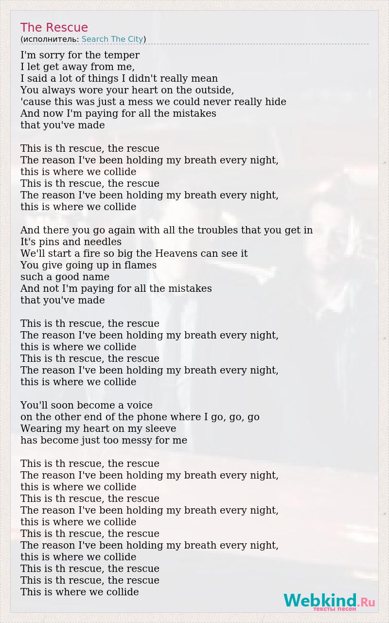 I'm sorry for the temper I let get away from me, I said a lot of things I didn't really mean You always wore your heart on the outside, 'cause this was just a mess we could never really hide And now I'm paying for all the mistakes that you've made This is th rescue, the rescue The reason I've been holding my breath every night, this is where we collide This is th rescue, the rescue The reason I've been holding my breath every night, this is where we collide And there you go again with all the troubles that you get in It's pins and needles We'll start a fire so big the Heavens can see it You give going up in flames such a good name And not I'm paying for all the mistakes that you've made This is th rescue, the rescue The reason I've been holding my breath every night, this is where we collide This is th rescue, the rescue The reason I've been holding my breath every night, this is where we collide You'll soon become a voice on the other end of the phone where I go, go, go Wearing my heart on my sleeve has become just too messy for me This is th rescue, the rescue The reason I've been holding my breath every night, this is where we collide This is th rescue, the rescue The reason I've been holding my breath every night, this is where we collide This is th rescue, the rescue The reason I've been holding my breath every night, this is where we collide This is th rescue, the rescue This is th rescue, the rescue This is where we collide