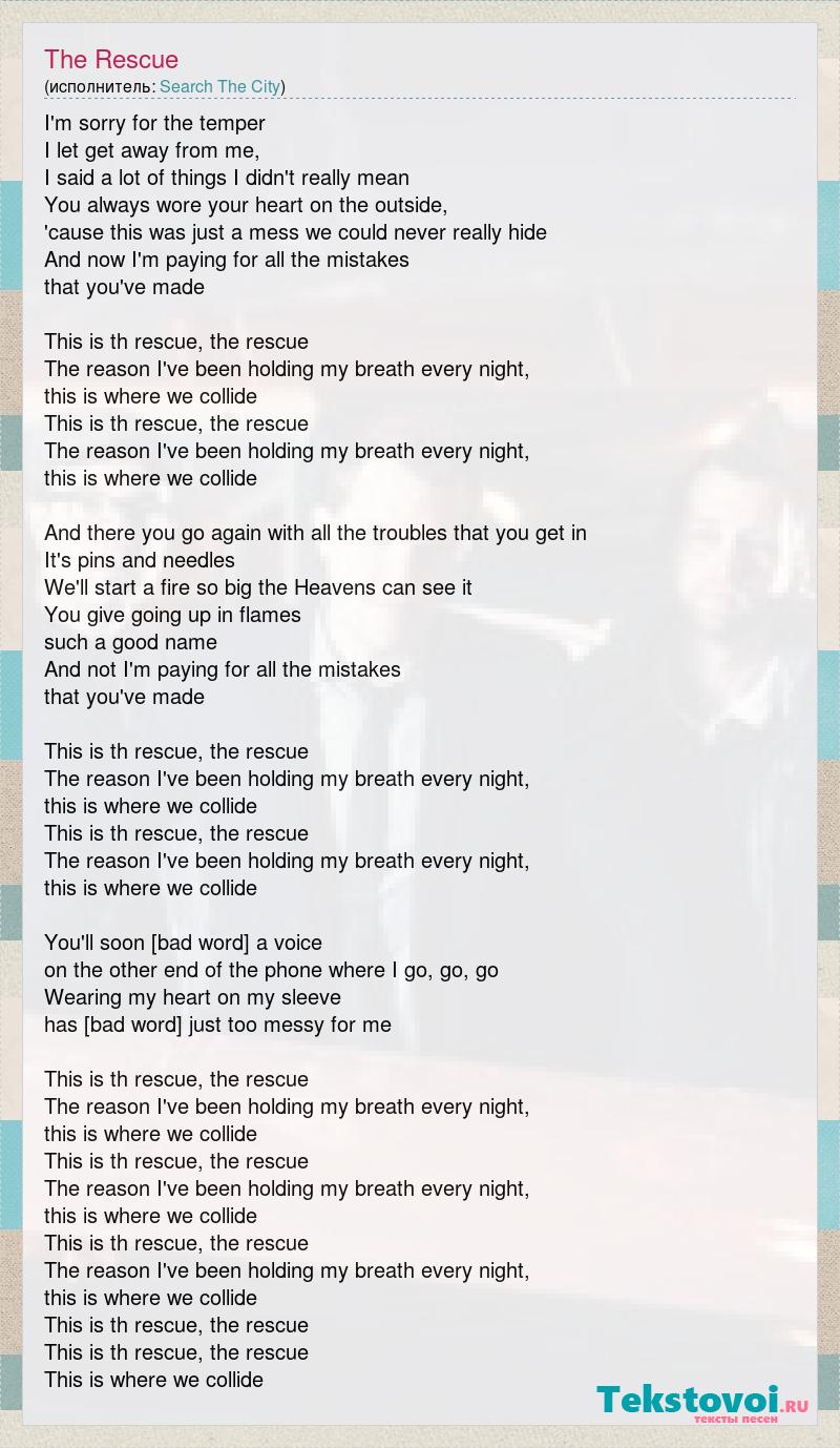 I'm sorry for the temper I let get away from me, I said a lot of things I didn't really mean You always wore your heart on the outside, 'cause this was just a mess we could never really hide And now I'm paying for all the mistakes that you've made This is th rescue, the rescue The reason I've been holding my breath every night, this is where we collide This is th rescue, the rescue The reason I've been holding my breath every night, this is where we collide And there you go again with all the troubles that you get in It's pins and needles We'll start a fire so big the Heavens can see it You give going up in flames such a good name And not I'm paying for all the mistakes that you've made This is th rescue, the rescue The reason I've been holding my breath every night, this is where we collide This is th rescue, the rescue The reason I've been holding my breath every night, this is where we collide You'll soon become a voice on the other end of the phone where I go, go, go Wearing my heart on my sleeve has become just too messy for me This is th rescue, the rescue The reason I've been holding my breath every night, this is where we collide This is th rescue, the rescue The reason I've been holding my breath every night, this is where we collide This is th rescue, the rescue The reason I've been holding my breath every night, this is where we collide This is th rescue, the rescue This is th rescue, the rescue This is where we collide