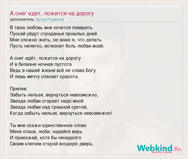 В твою любовь мне хочется поверить Пускай уйдут страданья прошлых дней Мне сложно жить, не знаю я, что делать Пусть нелегко, исчезнет боль любви моей. А снег идёт, ложится на дорогу И в белизне ночная пустота Ведь в нашей жизни всё не слава Богу И лишь мечту спасает красота. Припев: Забыть нельзя, вернуться невозможно, Звезда любви сгорает надо мной Звезда любви над грешной суетой, Когда забыть нельзя, вернуться невозможно! Ты мне скажи единственное слово Меня спаси, люби, надейся верь И приезжай, хотя бы ненадолго Своим ключом открой входную дверь.