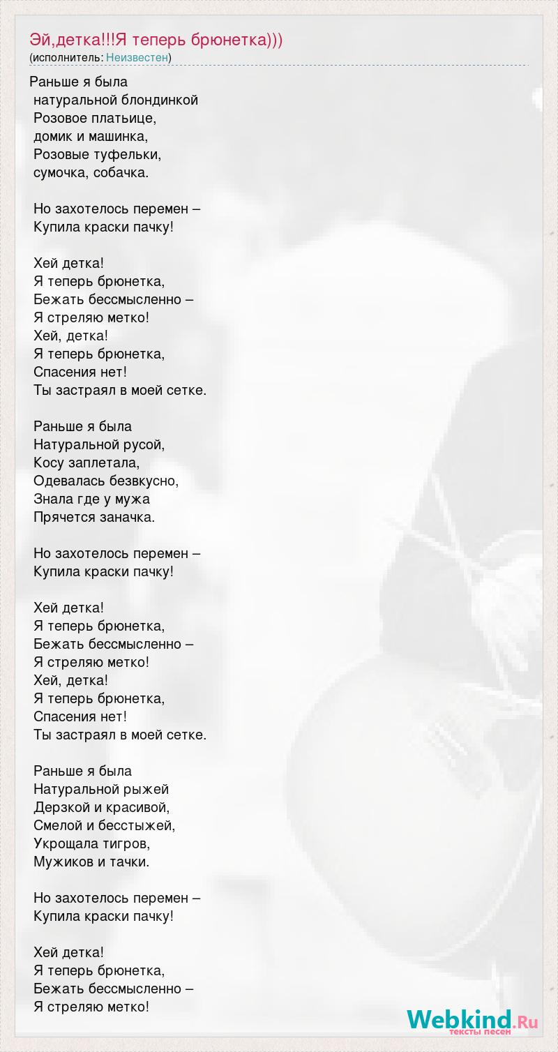 Раньше я была натуральной блондинкой Розовое платьице, домик и машинка, Розовые туфельки, сумочка, собачка. Но захотелось перемен – Купила краски пачку! Хей детка! Я теперь брюнетка, Бежать бессмысленно – Я стреляю метко! Хей, детка! Я теперь брюнетка, Спасения нет! Ты застраял в моей сетке. Раньше я была Натуральной русой, Косу заплетала, Одевалась безвкусно, Знала где у мужа Прячется заначка. Но захотелось перемен – Купила краски пачку! Хей детка! Я теперь брюнетка, Бежать бессмысленно – Я стреляю метко! Хей, детка! Я теперь брюнетка, Спасения нет! Ты застраял в моей сетке. Раньше я была Натуральной рыжей Дерзкой и красивой, Смелой и бесстыжей, Укрощала тигров, Мужиков и тачки. Но захотелось перемен – Купила краски пачку! Хей детка! Я теперь брюнетка, Бежать бессмысленно – Я стреляю метко!