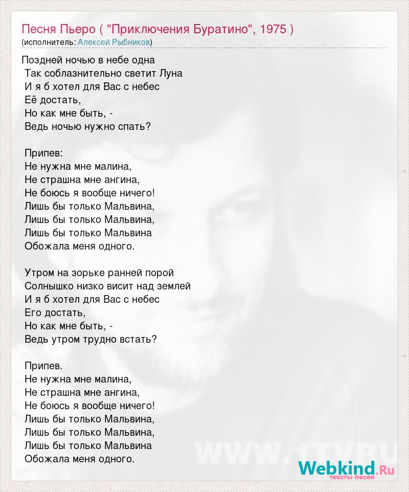 Поздней ночью в небе одна Так соблазнительно светит Луна И я б хотел для Вас с небес Её достать, Но как мне быть, - Ведь ночью нужно спать? Припев: Не нужна мне малина, Не страшна мне ангина, Не боюсь я вообще ничего! Лишь бы только Мальвина, Лишь бы только Мальвина, Лишь бы только Мальвина Обожала меня одного. Утром на зорьке ранней порой Солнышко низко висит над землей И я б хотел для Вас с небес Его достать, Но как мне быть, - Ведь утром трудно встать? Припев. Не нужна мне малина, Не страшна мне ангина, Не боюсь я вообще ничего! Лишь бы только Мальвина, Лишь бы только Мальвина, Лишь бы только Мальвина Обожала меня одного.