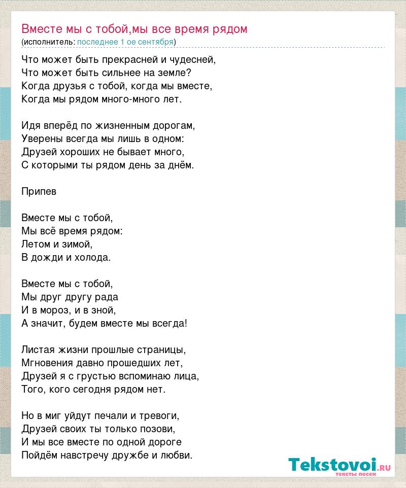 Что может быть прекрасней и чудесней, Что может быть сильнее на земле? Когда друзья с тобой, когда мы вместе, Когда мы рядом много-много лет. Идя вперёд по жизненным дорогам, Уверены всегда мы лишь в одном: Друзей хороших не бывает много, С которыми ты рядом день за днём. Припев Вместе мы с тобой, Мы всё время рядом: Летом и зимой, В дожди и холода. Вместе мы с тобой, Мы друг другу рада И в мороз, и в зной, А значит, будем вместе мы всегда! Листая жизни прошлые страницы, Мгновения давно прошедших лет, Друзей я с грустью вспоминаю лица, Того, кого сегодня рядом нет. Но в миг уйдут печали и тревоги, Друзей своих ты только позови, И мы все вместе по одной дороге Пойдём навстречу дружбе и любви.