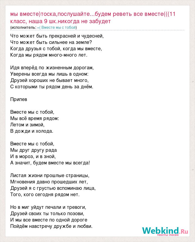 Что может быть прекрасней и чудесней, Что может быть сильнее на земле? Когда друзья с тобой, когда мы вместе, Когда мы рядом много-много лет. Идя вперёд по жизненным дорогам, Уверены всегда мы лишь в одном: Друзей хороших не бывает много, С которыми ты рядом день за днём. Припев Вместе мы с тобой, Мы всё время рядом: Летом и зимой, В дожди и холода. Вместе мы с тобой, Мы друг другу рада И в мороз, и в зной, А значит, будем вместе мы всегда! Листая жизни прошлые страницы, Мгновения давно прошедших лет, Друзей я с грустью вспоминаю лица, Того, кого сегодня рядом нет. Но в миг уйдут печали и тревоги, Друзей своих ты только позови, И мы все вместе по одной дороге Пойдём навстречу дружбе и любви.