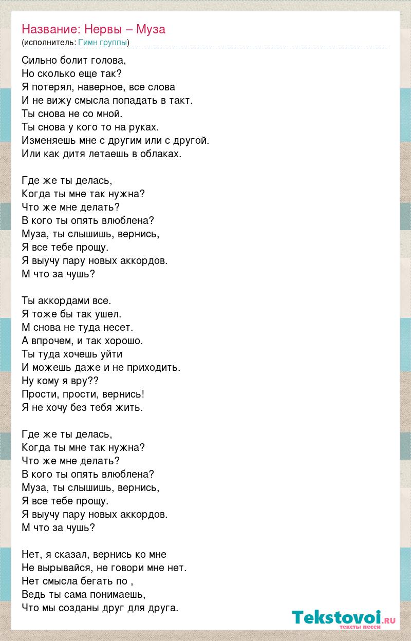 Сильно болит голова, Но сколько еще так? Я потерял, наверное, все слова И не вижу смысла попадать в такт. Ты снова не со мной. Ты снова у кого то на руках. Изменяешь мне с другим или с другой. Или как дитя летаешь в облаках. Где же ты делась, Когда ты мне так нужна? Что же мне делать? В кого ты опять влюблена? Муза, ты слышишь, вернись, Я все тебе прощу. Я выучу пару новых аккордов. М что за чушь? Ты аккордами все. Я тоже бы так ушел. М снова не туда несет. А впрочем, и так хорошо. Ты туда хочешь уйти И можешь даже и не приходить. Ну кому я вру?? Прости, прости, вернись! Я не хочу без тебя жить. Где же ты делась, Когда ты мне так нужна? Что же мне делать? В кого ты опять влюблена? Муза, ты слышишь, вернись, Я все тебе прощу. Я выучу пару новых аккордов. М что за чушь? Нет, я сказал, вернись ко мне Не вырывайся, не говори мне нет. Нет смысла бегать по , Ведь ты сама понимаешь, Что мы созданы друг для друга.