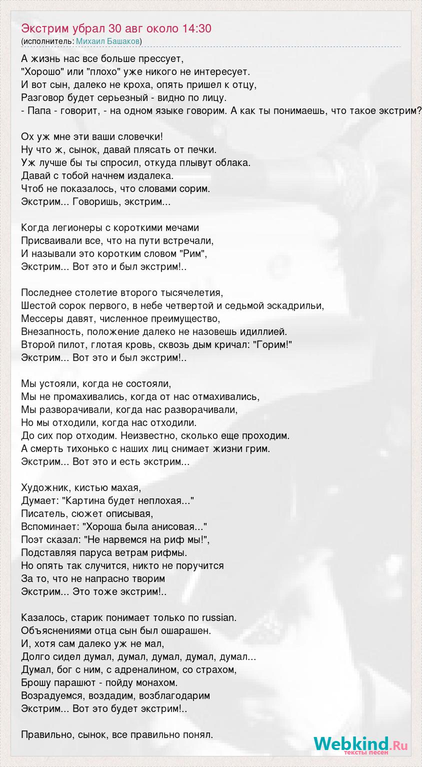 А жизнь нас все больше прессует, "Хорошо" или "плохо" уже никого не интересует. И вот сын, далеко не кроха, опять пришел к отцу, Разговор будет серьезный - видно по лицу. - Папа - говорит, - на одном языке говорим. А как ты понимаешь, что такое экстрим? Ох уж мне эти ваши словечки! Ну что ж, сынок, давай плясать от печки. Уж лучше бы ты спросил, откуда плывут облака. Давай с тобой начнем издалека. Чтоб не показалось, что словами сорим. Экстрим... Говоришь, экстрим... Когда легионеры с короткими мечами Присваивали все, что на пути встречали, И называли это коротким словом "Рим", Экстрим... Вот это и был экстрим!.. Последнее столетие второго тысячелетия, Шестой сорок первого, в небе четвертой и седьмой эскадрильи, Мессеры давят, численное преимущество, Внезапность, положение далеко не назовешь идиллией. Второй пилот, глотая кровь, сквозь дым кричал: "Горим!" Экстрим... Вот это и был экстрим!.. Мы устояли, когда не состояли, Мы не промахивались, когда от нас отмахивались, Мы разворачивали, когда нас разворачивали, Но мы отходили, когда нас отходили. До сих пор отходим. Неизвестно, сколько еще проходим. А смерть тихонько с наших лиц снимает жизни грим. Экстрим... Вот это и есть экстрим... Художник, кистью махая, Думает: "Картина будет неплохая..." Писатель, сюжет описывая, Вспоминает: "Хороша была анисовая..." Поэт сказал: "Не нарвемся на риф мы!", Подставляя паруса ветрам рифмы. Но опять так случится, никто не поручится За то, что не напрасно творим Экстрим... Это тоже экстрим!.. Казалось, старик понимает только по russian. Объяснениями отца сын был ошарашен. И, хотя сам далеко уж не мал, Долго сидел думал, думал, думал, думал, думал... Думал, бог с ним, с адреналином, со страхом, Брошу парашют - пойду монахом. Возрадуемся, воздадим, возблагодарим Экстрим... Вот это будет экстрим!.. Правильно, сынок, все правильно понял.