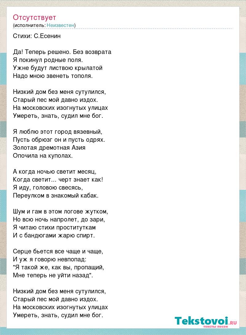 Стихи: С.Есенин Да! Теперь решено. Без возврата Я покинул родные поля. Ужне будут листвою крылатой Надо мною звенеть тополя. Низкий дом без меня сутулился, Старый пес мой давно издох. На московских изогнутых улицах Умереть, знать, судил мне бог. Я люблю этот город вязевный, Пусть обрюзг он и пусть одрях. Золотая дремотная Азия Опочила на куполах. А когда ночью светит месяц, Когда светит... черт знает как! Я иду, головою свесясь, Переулком в знакомый кабак. Шум и гам в этом логове жутком, Но всю ночь напролет, до зари, Я читаю стихи проституткам И с бандюгами жарю спирт. Серце бьется все чаще и чаще, И уж я говорю невпопад: "Я такой же, как вы, пропащий, Мне теперь не уйти назад". Низкий дом без меня сутулился, Старый пес мой давно издох. На московских изогнутых улицах Умереть, знать, судил мне бог.