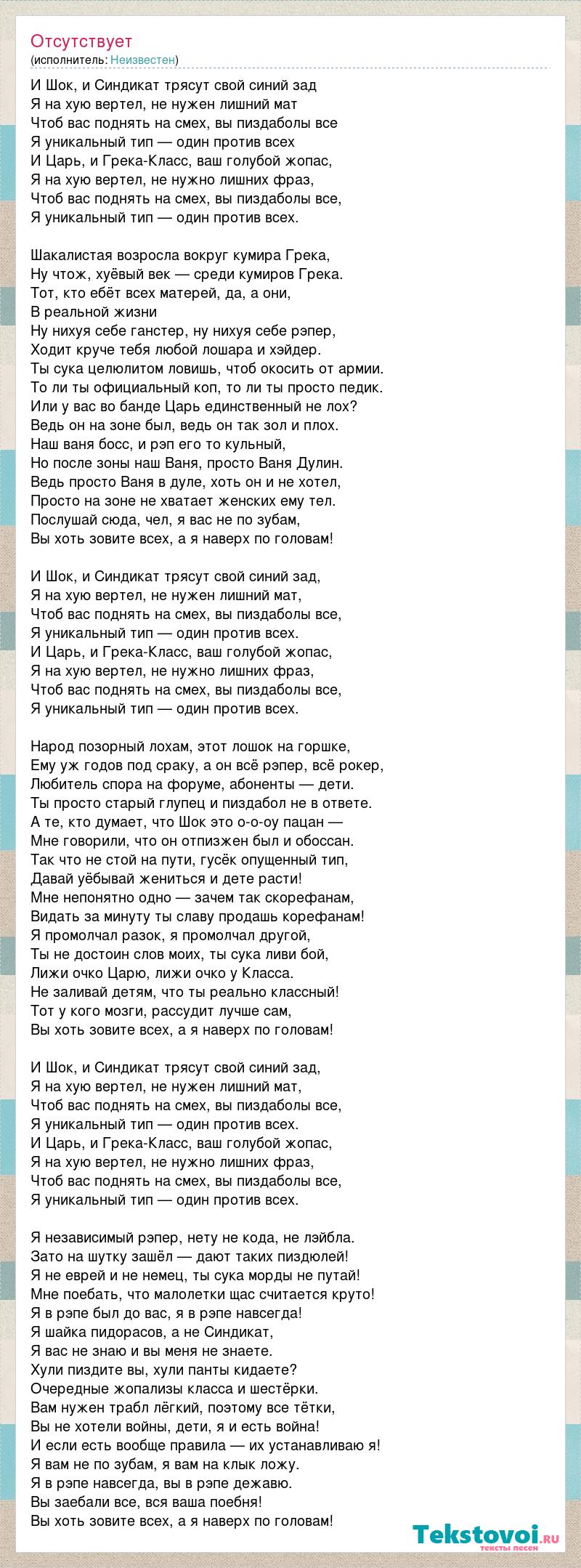 И Шок, и Синдикат трясут свой синий зад Я на хую вертел, не нужен лишний мат Чтоб вас поднять на смех, вы пиздаболы все Я уникальный тип — один против всех И Царь, и Грека-Класс, ваш голубой жопас, Я на хую вертел, не нужно лишних фраз, Чтоб вас поднять на смех, вы пиздаболы все, Я уникальный тип — один против всех. Шакалистая возросла вокруг кумира Грека, Ну чтож, хуёвый век — среди кумиров Грека. Тот, кто ебёт всех матерей, да, а они, В реальной жизни Ну нихуя себе ганстер, ну нихуя себе рэпер, Ходит круче тебя любой лошара и хэйдер. Ты сука целюлитом ловишь, чтоб окосить от армии. То ли ты официальный коп, то ли ты просто педик. Или у вас во банде Царь единственный не лох? Ведь он на зоне был, ведь он так зол и плох. Наш ваня босс, и рэп его то кульный, Но после зоны наш Ваня, просто Ваня Дулин. Ведь просто Ваня в дуле, хоть он и не хотел, Просто на зоне не хватает женских ему тел. Послушай сюда, чел, я вас не по зубам, Вы хоть зовите всех, а я наверх по головам! И Шок, и Синдикат трясут свой синий зад, Я на хую вертел, не нужен лишний мат, Чтоб вас поднять на смех, вы пиздаболы все, Я уникальный тип — один против всех. И Царь, и Грека-Класс, ваш голубой жопас, Я на хую вертел, не нужно лишних фраз, Чтоб вас поднять на смех, вы пиздаболы все, Я уникальный тип — один против всех. Народ позорный лохам, этот лошок на горшке, Ему уж годов под сраку, а он всё рэпер, всё рокер, Любитель спора на форуме, абоненты — дети. Ты просто старый глупец и пиздабол не в ответе. А те, кто думает, что Шок это о-о-оу пацан — Мне говорили, что он отпизжен был и обоссан. Так что не стой на пути, гусёк опущенный тип, Давай уёбывай жениться и дете расти! Мне непонятно одно — зачем так скорефанам, Видать за минуту ты славу продашь корефанам! Я промолчал разок, я промолчал другой, Ты не достоин слов моих, ты сука ливи бой, Лижи очко Царю, лижи очко у Класса. Не заливай детям, что ты реально классный! Тот у кого мозги, рассудит лучше сам, Вы хоть зовите всех, а я наверх по головам! И Шок, и Синдикат трясут свой синий зад, Я на хую вертел, не нужен лишний мат, Чтоб вас поднять на смех, вы пиздаболы все, Я уникальный тип — один против всех. И Царь, и Грека-Класс, ваш голубой жопас, Я на хую вертел, не нужно лишних фраз, Чтоб вас поднять на смех, вы пиздаболы все, Я уникальный тип — один против всех. Я независимый рэпер, нету не кода, не лэйбла. Зато на шутку зашёл — дают таких пиздюлей! Я не еврей и не немец, ты сука морды не путай! Мне поебать, что малолетки щас считается круто! Я в рэпе был до вас, я в рэпе навсегда! Я шайка пидорасов, а не Синдикат, Я вас не знаю и вы меня не знаете. Хули пиздите вы, хули панты кидаете? Очередные жопализы класса и шестёрки. Вам нужен трабл лёгкий, поэтому все тётки, Вы не хотели войны, дети, я и есть война! И если есть вообще правила — их устанавливаю я! Я вам не по зубам, я вам на клык ложу. Я в рэпе навсегда, вы в рэпе дежавю. Вы заебали все, вся ваша поебня! Вы хоть зовите всех, а я наверх по головам!