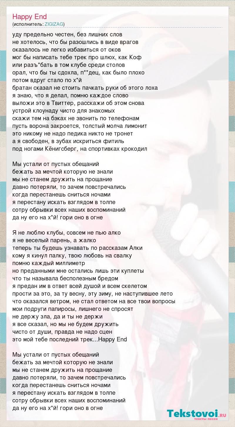 уду предельно честен, без лишних слов не хотелось, что бы разошлись в виде врагов оказалось не легко избавиться от оков мог бы написать тебе трек про шлюх, как Коф или разъ*бать в том клубе среди столов орал, что бы ты сдохла, п**дец, как было плохо потом вдруг стало по х*й братан сказал не стоить пачкать руки об этого лоха я знаю, что я делал, помню каждое слово выложи это в Твиттер, расскажи об этом снова устрой клоунаду чисто для знакомых скажи тем на бэках не звонить по телефонам пусть ворона закроется, толстый молча лимонит это никому не надо педика никто не тронет а я свободен, в зубах искриться фитиль под ногами Кёнигсберг, на спортивках крокодил Мы устали от пустых обещаний бежать за мечтой которую не знали мы не станем дружить на прощание давно потеряли, то зачем повстречались когда перестанешь сниться ночами я перестану искать взглядом в толпе сотру обрывки всех наших воспоминаний да ну его на х*й! гори оно в огне Я не люблю клубы, совсем не пью алко я не веселый парень, а жалко теперь ты будешь узнавать по рассказам Алки кому я кинул палку, твою любовь на свалку помню каждый миллиметр но преданными мне остались лишь эти куплеты что ты называла бесполезным бредом я предан им в ответ всей душой и всем скелетом прости за это, за ту весну, эту зиму, не наступившее лето что оказался ветром, не стал ответом на все твои вопросы мои подруги папиросы, лишнего не спросят не держу зла, да и ты не держи я все сказал, но мы не будем дружить чисто от души, правда не надо сцен это мой тебе последний трек...Happy End Мы устали от пустых обещаний бежать за мечтой которую не знали мы не станем дружить на прощание давно потеряли, то зачем повстречались когда перестанешь сниться ночами я перестану искать взглядом в толпе сотру обрывки всех наших воспоминаний да ну его на х*й! гори оно в огне