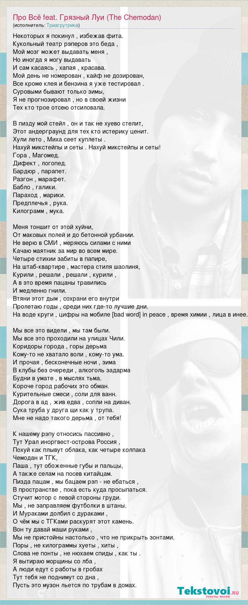 Некоторых я покинул , избежав фита. Кукольный театр рэперов это беда , Мой мозг может выдавать меня , Но иногда я могу выдавать И сам касаясь , хапая , красава. Мой день не номерован , кайф не дозирован, Все кроме клея и бензина я уже тестировал . Суровыми бывают только зимы, Я не прогнозировал , но в своей жизни Тех кто трое отсею отсиловала. В пизду мой стейл , он и так не хуево стелит, Этот андерграунд для тех кто истерику ценит. Хули лето , Миха сеет куплеты . Нахуй микстейпы и сеты . Нахуй микстейпы и сеты! Гора , Магомед. Дифект , логопед. Бардюр , парапет. Разгон , марафет. Бабло , галики. Параход , марики. Предплечья , рука. Килограмм , мука. Меня тоншит от этой хуйни, От маковых полей и до бетонной урбании. Не верю в СМИ , меряюсь силами с ними Качаю маятник за мир во всем мире. Четыре стихии забиты в папире, На штаб-квартире , мастера стиля шаолиня, Курили , решали , решали , курили , А в это время пацаны травились И медленно гнили. Втяни этот дым , сохрани его внутри Пролетаю годы , среди них где-то лучшие дни. На воде круги , цифры на мобиле Rust in peace , время химии , лица в инее. Мы все это видели , мы там были. Мы все это проходили на улицах Чили. Коридоры города , горы дерьма Кому-то не хватало воли , кому-то ума. И прочая , бесконечные ночи , зима В клубы без очереди , алкоголь задарма Будни в умате , в мыслях тьма. Короче город рабочих это обман. Курительные смеси , соли для ванн. Дорога в ад , жив едва , сопли на диван. Сука труба у друга щи как у трупа. Мне не надо такого дерьма , от тебя! К нашему рэпу относись пассивно , Тут Урал иноргвест-острова Россия , Похуй как плывут облака, как четыре колпака Чемодан и ТГК, Паша , тут обоженные губы и пальцы, А также селам на посев китайцам. Пизда пацам , мы бацаем рэп - не ебаться , В пространстве , пока есть куда просыпаться. Стучит мотор с левой стороны груди. Мы , не заправляем футболки в штаны. И Мураками долбил с дураками , О чём мы с ТГКами раскурят этот камень. Вон ту давай маши руками , Мы не пристойны настолько , что не прикрыть зонтами. Поры , не килограммы хуеты , хиты , Слова не понты , не нюхаем спиды , как ты . Я вытираю морщины со лба , А люди едут с работы в гробах Тут тебя не поднимут со дна , Пусть это музон льется по трубам в домах.