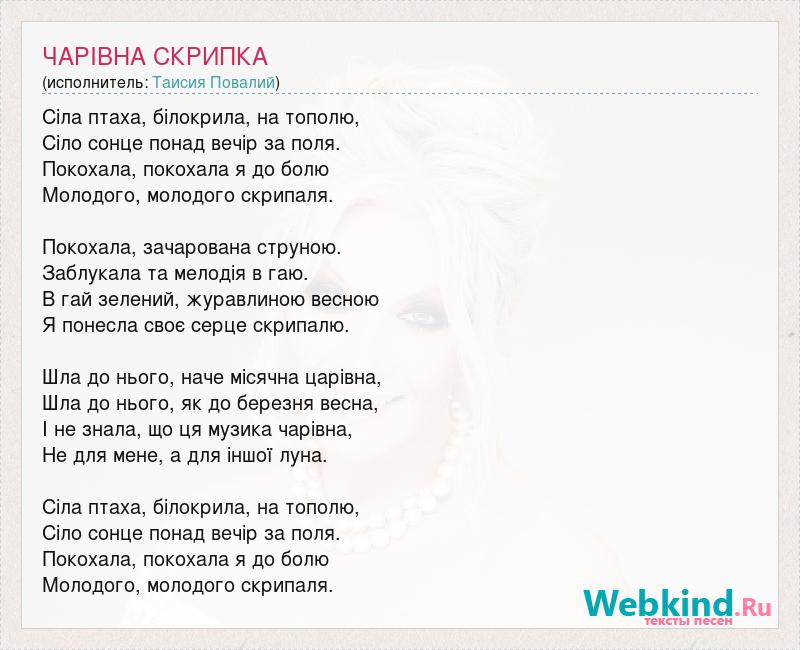Сіла птаха, білокрила, на тополю, Сіло сонце понад вечір за поля. Покохала, покохала я до болю Молодого, молодого скрипаля. Покохала, зачарована струною. Заблукала та мелодія в гаю. В гай зелений, журавлиною весною Я понесла своє серце скрипалю. Шла до нього, наче місячна царівна, Шла до нього, як до березня весна, І не знала, що ця музика чарівна, Не для мене, а для іншої луна. Сіла птаха, білокрила, на тополю, Сіло сонце понад вечір за поля. Покохала, покохала я до болю Молодого, молодого скрипаля.