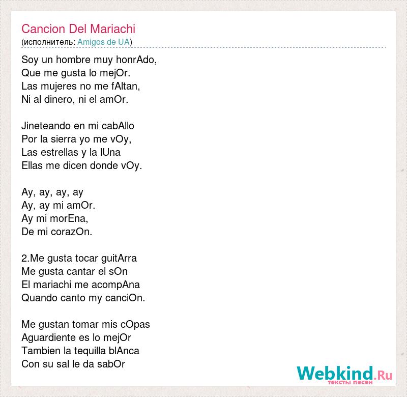 Soy un hombre muy honrAdo, Que me gusta lo mejOr. Las mujeres no me fAltan, Ni al dinero, ni el amOr. Jineteando en mi cabAllo Por la sierra yo me vOy, Las estrellas y la lUna Ellas me dicen donde vOy. Ay, ay, ay, ay Ay, ay mi amOr. Ay mi morEna, De mi corazOn. 2.Me gusta tocar guitArra Me gusta cantar el sOn El mariachi me acompAna Quando canto my canciOn. Me gustan tomar mis cOpas Aguardiente es lo mejOr Tambien la tequilla blAnca Con su sal le da sabOr