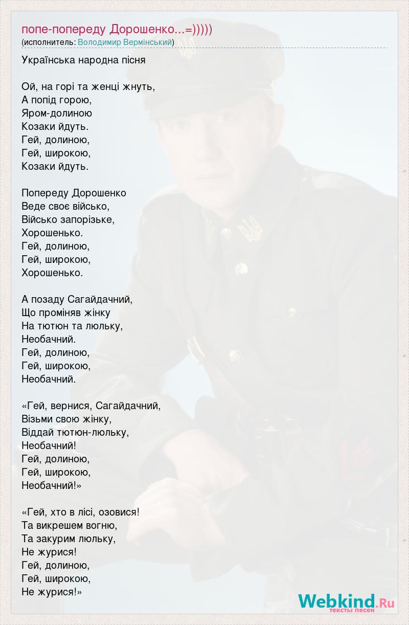 А как ты думаешь, о чем песня "Попе-попереду Дорошенко...=)))))" ?