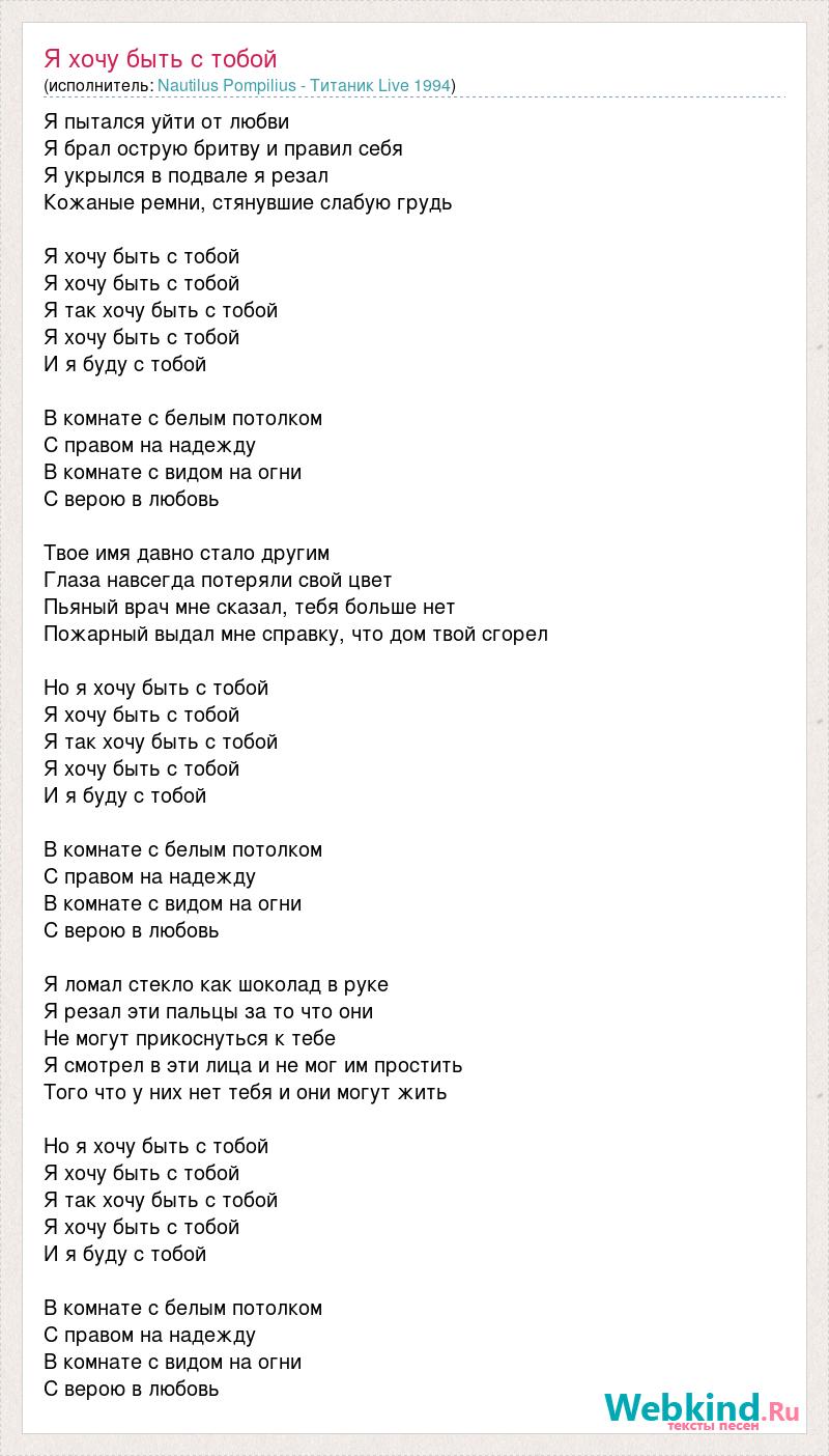 Я пытался уйти от любви Я брал острую бритву и правил себя Я укрылся в подвале я резал Кожаные ремни, стянувшие слабую грудь Я хочу быть с тобой Я хочу быть с тобой Я так хочу быть с тобой Я хочу быть с тобой И я буду с тобой В комнате с белым потолком С правом на надежду В комнате с видом на огни С верою в любовь Твое имя давно стало другим Глаза навсегда потеряли свой цвет Пьяный врач мне сказал, тебя больше нет Пожарный выдал мне справку, что дом твой сгорел Но я хочу быть с тобой Я хочу быть с тобой Я так хочу быть с тобой Я хочу быть с тобой И я буду с тобой В комнате с белым потолком С правом на надежду В комнате с видом на огни С верою в любовь Я ломал стекло как шоколад в руке Я резал эти пальцы за то что они Не могут прикоснуться к тебе Я смотрел в эти лица и не мог им простить Того что у них нет тебя и они могут жить Но я хочу быть с тобой Я хочу быть с тобой Я так хочу быть с тобой Я хочу быть с тобой И я буду с тобой В комнате с белым потолком С правом на надежду В комнате с видом на огни С верою в любовь