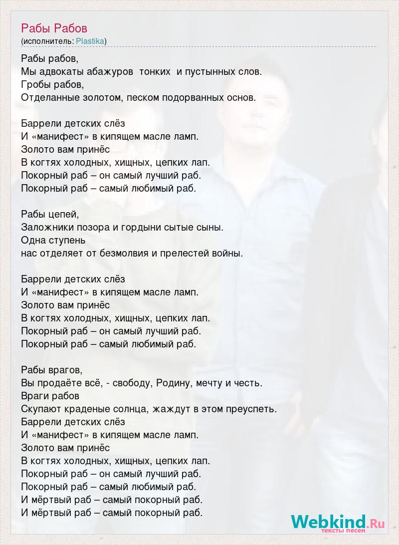 Рабы рабов, Мы адвокаты абажуров тонких и пустынных слов. Гробы рабов, Отделанные золотом, песком подорванных основ. Баррели детских слёз И «манифест» в кипящем масле ламп. Золото вам принёс В когтях холодных, хищных, цепких лап. Покорный раб – он самый лучший раб. Покорный раб – самый любимый раб. Рабы цепей, Заложники позора и гордыни сытые сыны. Одна ступень нас отделяет от безмолвия и прелестей войны. Баррели детских слёз И «манифест» в кипящем масле ламп. Золото вам принёс В когтях холодных, хищных, цепких лап. Покорный раб – он самый лучший раб. Покорный раб – самый любимый раб. Рабы врагов, Вы продаёте всё, - свободу, Родину, мечту и честь. Враги рабов Скупают краденые солнца, жаждут в этом преуспеть. Баррели детских слёз И «манифест» в кипящем масле ламп. Золото вам принёс В когтях холодных, хищных, цепких лап. Покорный раб – он самый лучший раб. Покорный раб – самый любимый раб. И мёртвый раб – самый покорный раб. И мёртвый раб – самый покорный раб.