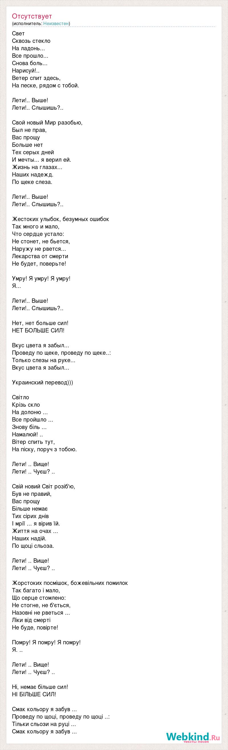 Свет Сквозь стекло На ладонь... Все прошло... Снова боль... Нарисуй!.. Ветер спит здесь, На песке, рядом с тобой. Лети!.. Выше! Лети!.. Слышишь?.. Свой новый Мир разобью, Был не прав, Вас прощу Больше нет Тех серых дней И мечты... я верил ей. Жизнь на глазах... Наших надежд. По щеке слеза. Лети!.. Выше! Лети!.. Слышишь?.. Жестоких улыбок, безумных ошибок Так много и мало, Что сердце устало: Не стонет, не бьется, Наружу не рвется... Лекарства от смерти Не будет, поверьте! Умру! Я умру! Я умру! Я... Лети!.. Выше! Лети!.. Слышишь?.. Нет, нет больше сил! НЕТ БОЛЬШЕ СИЛ! Вкус цвета я забыл... Проведу по щеке, проведу по щеке..: Только слезы на руке... Вкус цвета я забыл... Украинский перевод))) Світло Крізь скло На долоню ... Все пройшло ... Знову біль ... Намалюй! .. Вітер спить тут, На піску, поруч з тобою. Лети! .. Вище! Лети! .. Чуєш? .. Свій новий Світ розіб'ю, Був не правий, Вас прощу Більше немає Тих сірих днів І мрії ... я вірив їй. Життя на очах ... Наших надій. По щоці сльоза. Лети! .. Вище! Лети! .. Чуєш? .. Жорстоких посмішок, божевільних помилок Так багато і мало, Що серце стомлено: Не стогне, не б'ється, Назовні не рветься ... Ліки від смерті Не буде, повірте! Помру! Я помру! Я помру! Я. .. Лети! .. Вище! Лети! .. Чуєш? .. Ні, немає більше сил! НІ БІЛЬШЕ СИЛ! Смак кольору я забув ... Проведу по щоці, проведу по щоці ..: Тільки сльози на руці ... Смак кольору я забув ...