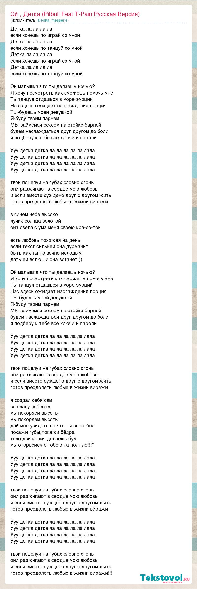 Детка ла ла ла ла если хочешь по играй со мной Детка ла ла ла ла если хочешь по танцуй со мной Детка ла ла ла ла если хочешь по играй со мной Детка ла ла ла ла если хочешь по танцуй со мной Эй,малышка что ты делаешь ночью? Я хочу посмотреть как сможешь помочь мне Ты танцуя отдашься в море эмоций Нас здесь ожидает наслаждения порция ТЫ-будешь моей девушкой Я-буду твоим парнем МЫ-займёмся сексом на стойке барной будем наслаждаться друг другом до боли я подберу к тебе все ключи и пароли Ууу детка детка ла ла ла ла ла лала Ууу детка детка ла ла ла ла ла лала Ууу детка детка ла ла ла ла ла лала Ууу детка детка ла ла ла ла ла лала твои поцелуи на губах словно огонь они разжигают в сердце мою любовь и если вместе суждено друг с другом жить готов преодолеть любые в жизни виражи в синем небе высоко лучик солнца золотой она свела с ума меня своею кра-со-той есть любовь похожая на день если текст сильней она дурманит быть как ты но вечно молодым дать ей волю...и она встанет )) Эй,малышка что ты делаешь ночью? Я хочу посмотреть как сможешь помочь мне Ты танцуя отдашься в море эмоций Нас здесь ожидает наслаждения порция ТЫ-будешь моей девушкой Я-буду твоим парнем МЫ-займёмся сексом на стойке барной будем наслаждаться друг другом до боли я подберу к тебе все ключи и пароли Ууу детка детка ла ла ла ла ла лала Ууу детка детка ла ла ла ла ла лала Ууу детка детка ла ла ла ла ла лала Ууу детка детка ла ла ла ла ла лала твои поцелуи на губах словно огонь они разжигают в сердце мою любовь и если вместе суждено друг с другом жить готов преодолеть любые в жизни виражи я создал себя сам во славу небесам мы покоряем высоты мы покоряем высоты дай мне увидеть на что ты способна покажи губы,покажи бёдра тело движения делаешь бум мы оторвёмся с тобою на полную!!!* Ууу детка детка ла ла ла ла ла лала Ууу детка детка ла ла ла ла ла лала Ууу детка детка ла ла ла ла ла лала Ууу детка детка ла ла ла ла ла лала твои поцелуи на губах словно огонь они разжигают в сердце мою любовь и если вместе суждено друг с другом жить готов преодолеть любые в жизни виражи Ууу детка детка ла ла ла ла ла лала Ууу детка детка ла ла ла ла ла лала Ууу детка детка ла ла ла ла ла лала Ууу детка детка ла ла ла ла ла лала твои поцелуи на губах словно огонь они разжигают в сердце мою любовь и если вместе суждено друг с другом жить готов преодолеть любые в жизни виражи!!!