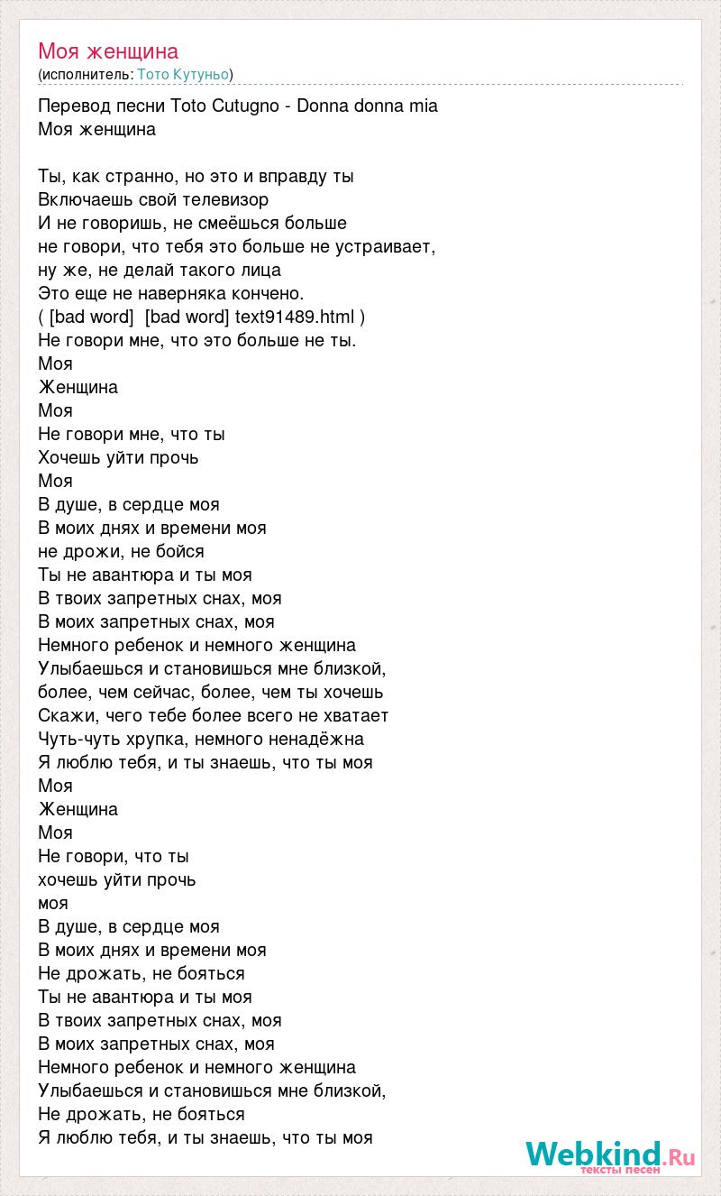 Перевод песни Toto Cutugno - Donna donna mia Моя женщина Ты, как странно, но это и вправду ты Включаешь свой телевизор И не говоришь, не смеёшься больше не говори, что тебя это больше не устраивает, ну же, не делай такого лица Это еще не наверняка кончено. ( [bad word] [bad word] text91489.html ) Не говори мне, что это больше не ты. Моя Женщина Моя Не говори мне, что ты Хочешь уйти прочь Моя В душе, в сердце моя В моих днях и времени моя не дрожи, не бойся Ты не авантюра и ты моя В твоих запретных снах, моя В моих запретных снах, моя Немного ребенок и немного женщина Улыбаешься и становишься мне близкой, более, чем сейчас, более, чем ты хочешь Скажи, чего тебе более всего не хватает Чуть-чуть хрупка, немного ненадёжна Я люблю тебя, и ты знаешь, что ты моя Моя Женщина Моя Не говори, что ты хочешь уйти прочь моя В душе, в сердце моя В моих днях и времени моя Не дрожать, не бояться Ты не авантюра и ты моя В твоих запретных снах, моя В моих запретных снах, моя Немного ребенок и немного женщина Улыбаешься и становишься мне близкой, Не дрожать, не бояться Я люблю тебя, и ты знаешь, что ты моя