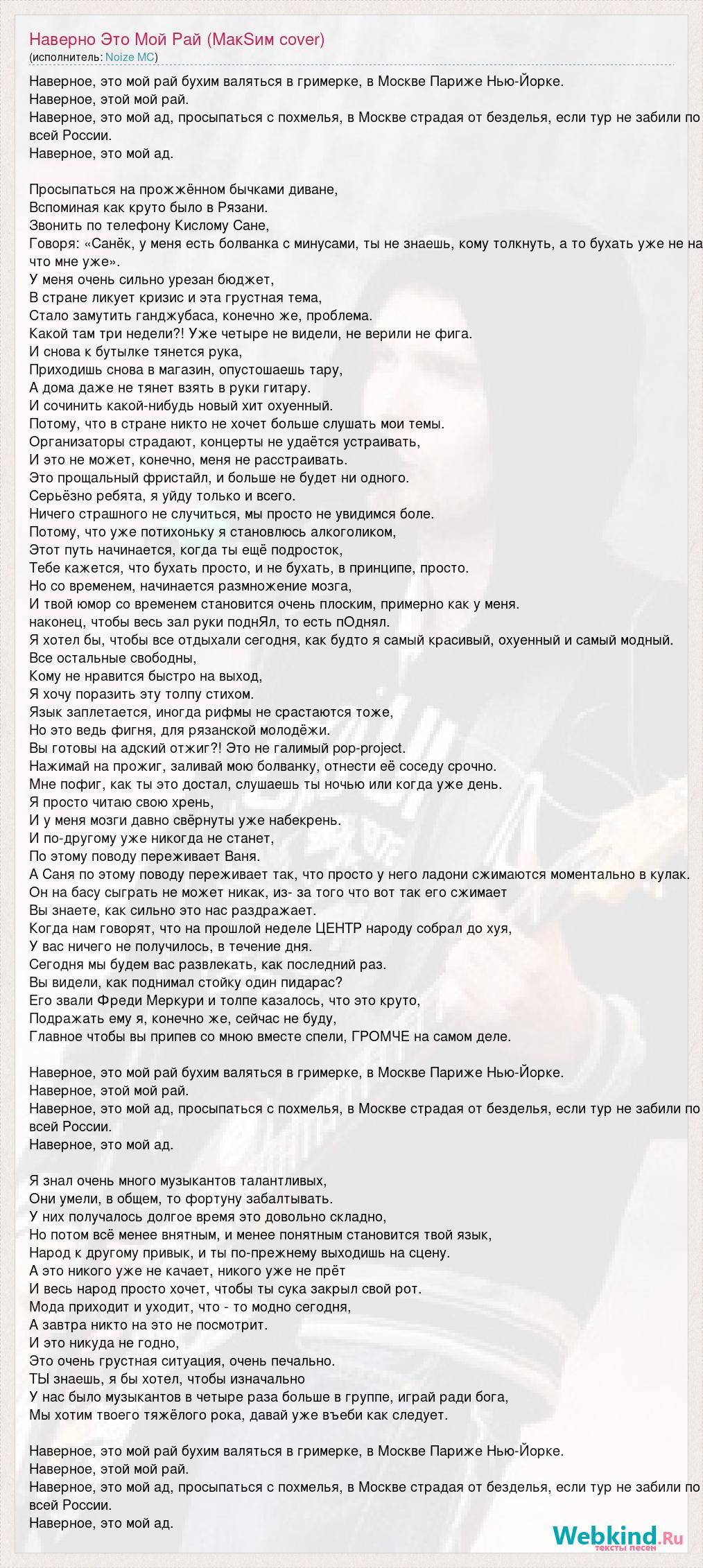 Наверное, это мой рай бухим валяться в гримерке, в Москве Париже Нью-Йорке. Наверное, этой мой рай. Наверное, это мой ад, просыпаться с похмелья, в Москве страдая от безделья, если тур не забили по всей России. Наверное, это мой ад. Просыпаться на прожжённом бычками диване, Вспоминая как круто было в Рязани. Звонить по телефону Кислому Сане, Говоря: «Санёк, у меня есть болванка с минусами, ты не знаешь, кому толкнуть, а то бухать уже не на что мне уже». У меня очень сильно урезан бюджет, В стране ликует кризис и эта грустная тема, Стало замутить ганджубаса, конечно же, проблема. Какой там три недели?! Уже четыре не видели, не верили не фига. И снова к бутылке тянется рука, Приходишь снова в магазин, опустошаешь тару, А дома даже не тянет взять в руки гитару. И сочинить какой-нибудь новый хит охуенный. Потому, что в стране никто не хочет больше слушать мои темы. Организаторы страдают, концерты не удаётся устраивать, И это не может, конечно, меня не расстраивать. Это прощальный фристайл, и больше не будет ни одного. Серьёзно ребята, я уйду только и всего. Ничего страшного не случиться, мы просто не увидимся боле. Потому, что уже потихоньку я становлюсь алкоголиком, Этот путь начинается, когда ты ещё подросток, Тебе кажется, что бухать просто, и не бухать, в принципе, просто. Но со временем, начинается размножение мозга, И твой юмор со временем становится очень плоским, примерно как у меня. наконец, чтобы весь зал руки поднЯл, то есть пОднял. Я хотел бы, чтобы все отдыхали сегодня, как будто я самый красивый, охуенный и самый модный. Все остальные свободны, Кому не нравится быстро на выход, Я хочу поразить эту толпу стихом. Язык заплетается, иногда рифмы не срастаются тоже, Но это ведь фигня, для рязанской молодёжи. Вы готовы на адский отжиг?! Это не галимый pop-project. Нажимай на прожиг, заливай мою болванку, отнести её соседу срочно. Мне пофиг, как ты это достал, слушаешь ты ночью или когда уже день. Я просто читаю свою хрень, И у меня мозги давно свёрнуты уже набекрень. И по-другому уже никогда не станет, По этому поводу переживает Ваня. А Саня по этому поводу переживает так, что просто у него ладони сжимаются моментально в кулак. Он на басу сыграть не может никак, из- за того что вот так его сжимает Вы знаете, как сильно это нас раздражает. Когда нам говорят, что на прошлой неделе ЦЕНТР народу собрал до хуя, У вас ничего не получилось, в течение дня. Сегодня мы будем вас развлекать, как последний раз. Вы видели, как поднимал стойку один пидарас? Его звали Фреди Меркури и толпе казалось, что это круто, Подражать ему я, конечно же, сейчас не буду, Главное чтобы вы припев со мною вместе спели, ГРОМЧЕ на самом деле. Наверное, это мой рай бухим валяться в гримерке, в Москве Париже Нью-Йорке. Наверное, этой мой рай. Наверное, это мой ад, просыпаться с похмелья, в Москве страдая от безделья, если тур не забили по всей России. Наверное, это мой ад. Я знал очень много музыкантов талантливых, Они умели, в общем, то фортуну забалтывать. У них получалось долгое время это довольно складно, Но потом всё менее внятным, и менее понятным становится твой язык, Народ к другому привык, и ты по-прежнему выходишь на сцену. А это никого уже не качает, никого уже не прёт И весь народ просто хочет, чтобы ты сука закрыл свой рот. Мода приходит и уходит, что - то модно сегодня, А завтра никто на это не посмотрит. И это н