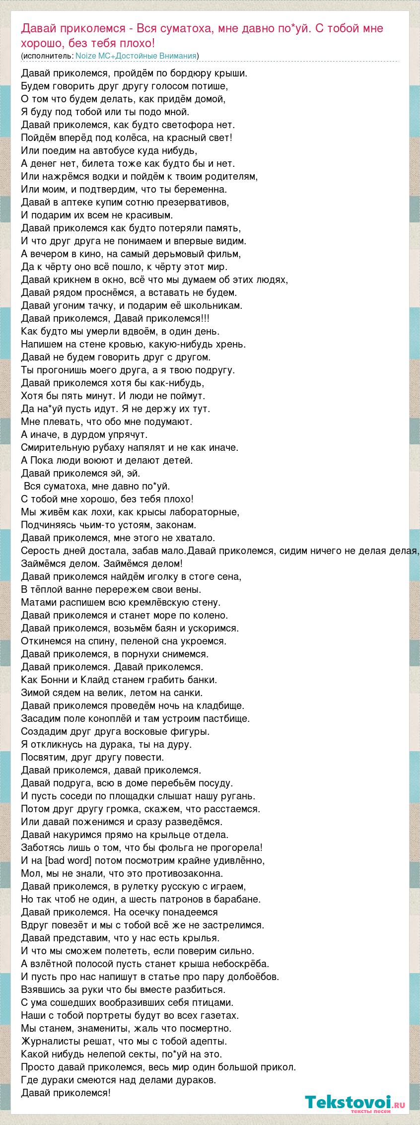 Главная→Исполнители→Noize MC+Достойные Внимания→Давай приколемся - Вся суматоха, мне давно по*уй. С тобой мне хорошо, без те