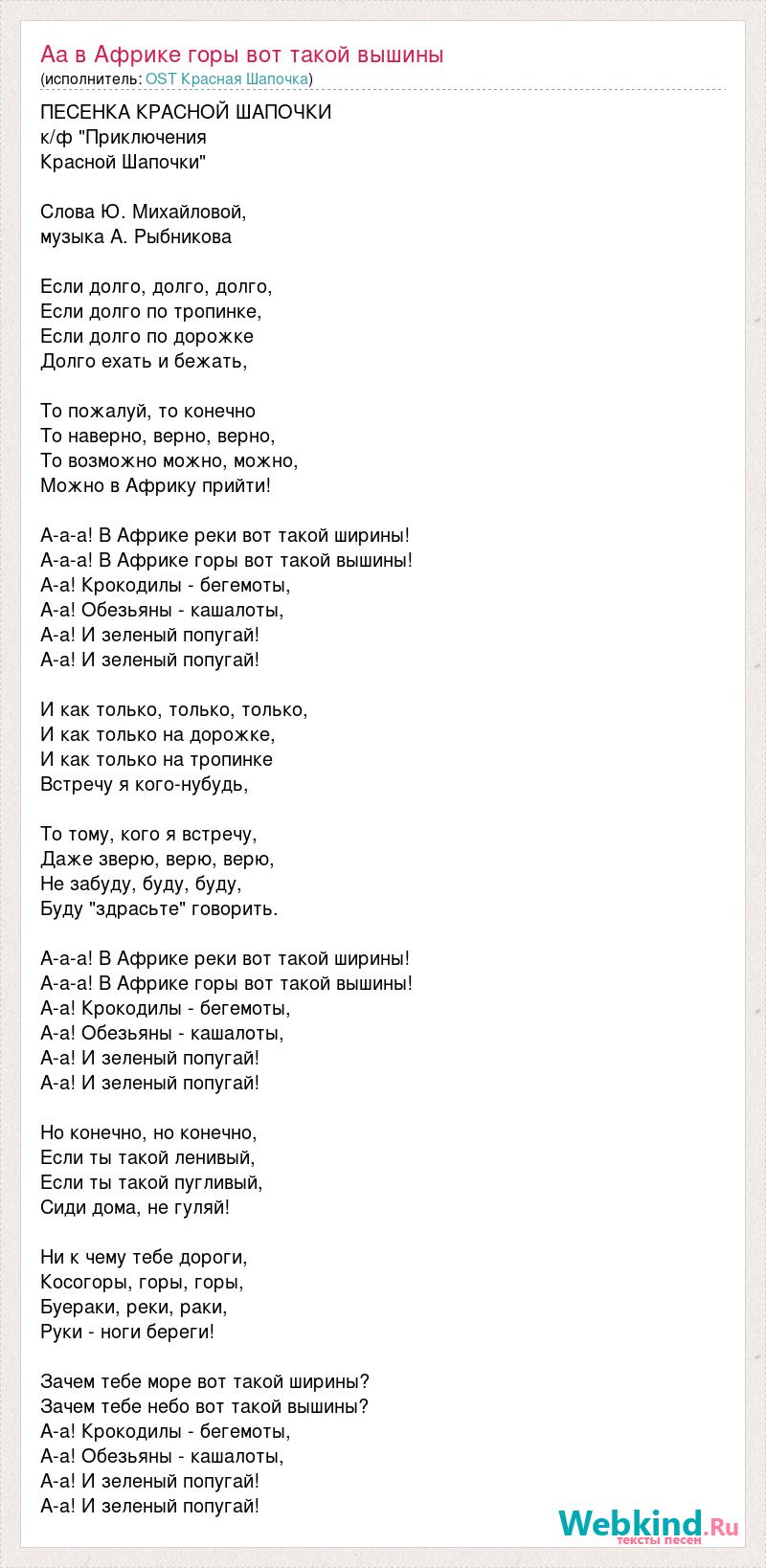 ПЕСЕНКА КРАСНОЙ ШАПОЧКИ к/ф "Приключения Красной Шапочки" Слова Ю. Михайловой, музыка А. Рыбникова Если долго, долго, долго, Если долго по тропинке, Если долго по дорожке Долго ехать и бежать, То пожалуй, то конечно То наверно, верно, верно, То возможно можно, можно, Можно в Африку прийти! А-а-а! В Африке реки вот такой ширины! А-а-а! В Африке горы вот такой вышины! А-а! Крокодилы - бегемоты, А-а! Обезьяны - кашалоты, А-а! И зеленый попугай! А-а! И зеленый попугай! И как только, только, только, И как только на дорожке, И как только на тропинке Встречу я кого-нубудь, То тому, кого я встречу, Даже зверю, верю, верю, Не забуду, буду, буду, Буду "здрасьте" говорить. А-а-а! В Африке реки вот такой ширины! А-а-а! В Африке горы вот такой вышины! А-а! Крокодилы - бегемоты, А-а! Обезьяны - кашалоты, А-а! И зеленый попугай! А-а! И зеленый попугай! Но конечно, но конечно, Если ты такой ленивый, Если ты такой пугливый, Сиди дома, не гуляй! Ни к чему тебе дороги, Косогоры, горы, горы, Буераки, реки, раки, Руки - ноги береги! Зачем тебе море вот такой ширины? Зачем тебе небо вот такой вышины? А-а! Крокодилы - бегемоты, А-а! Обезьяны - кашалоты, А-а! И зеленый попугай! А-а! И зеленый попугай!